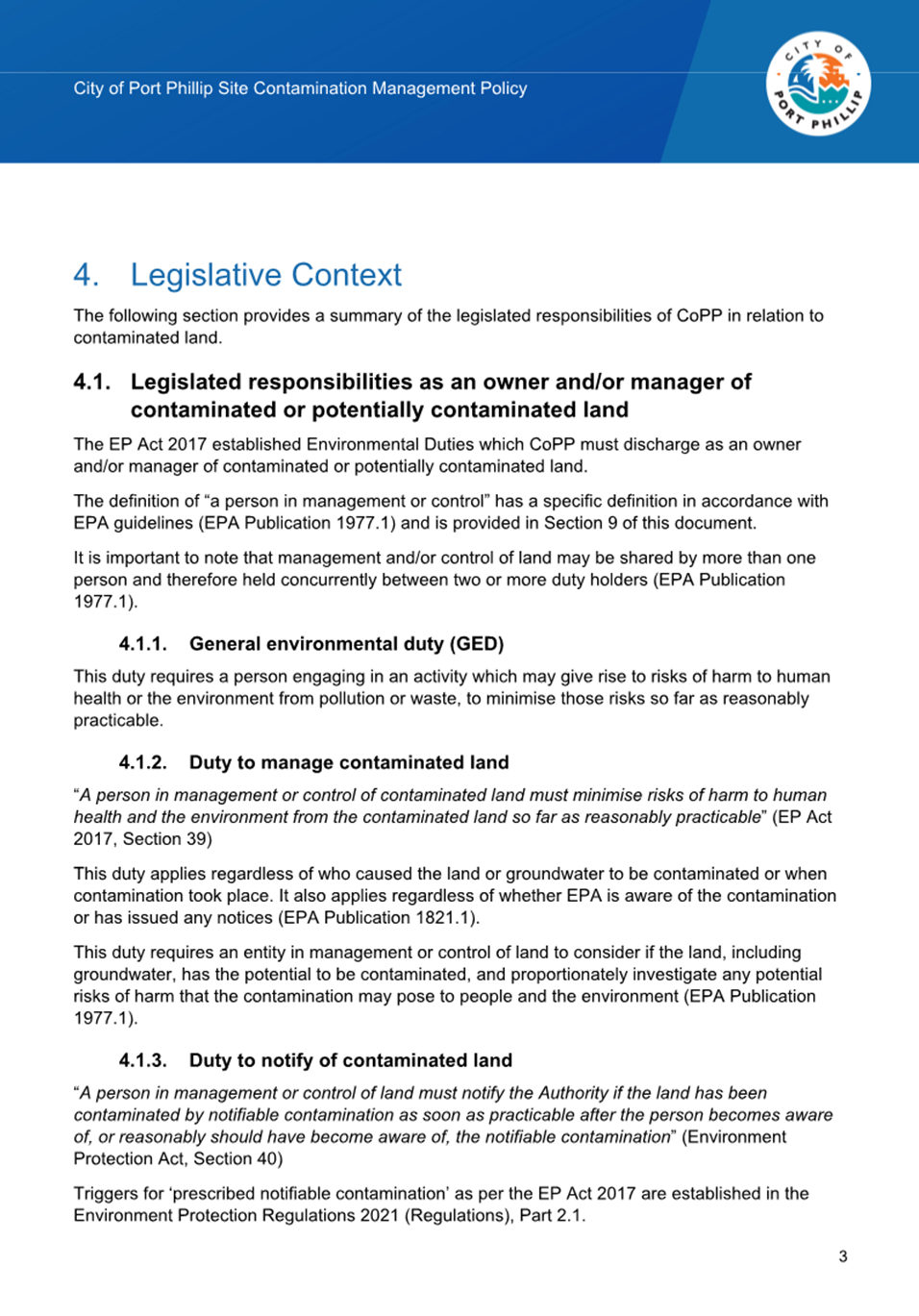 4.9 The following is a summary of key environmental duties relevant to Council in its role as an “entity in control or management” of contaminated or potentially contaminated land under the Environment Protection Act 2017: