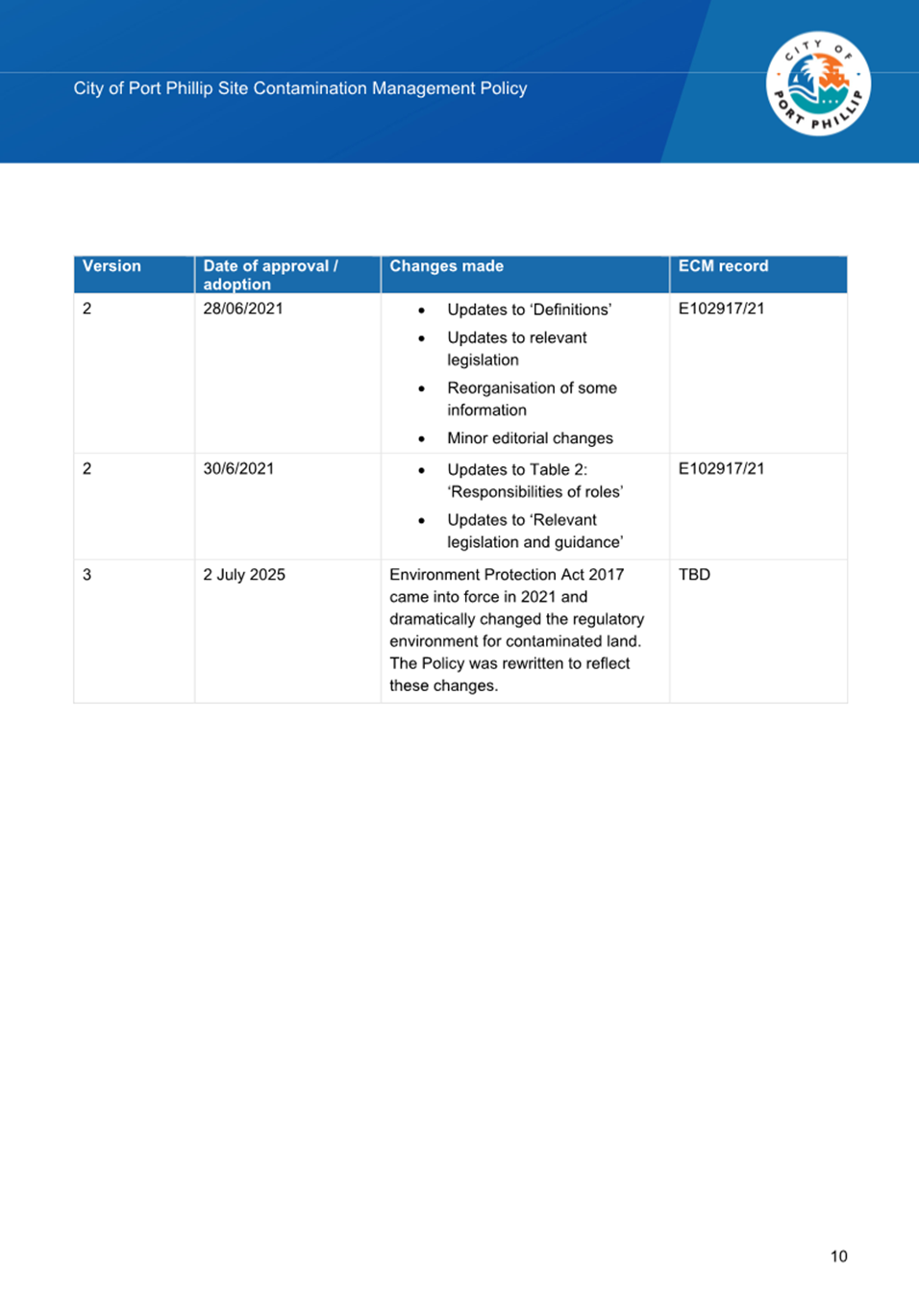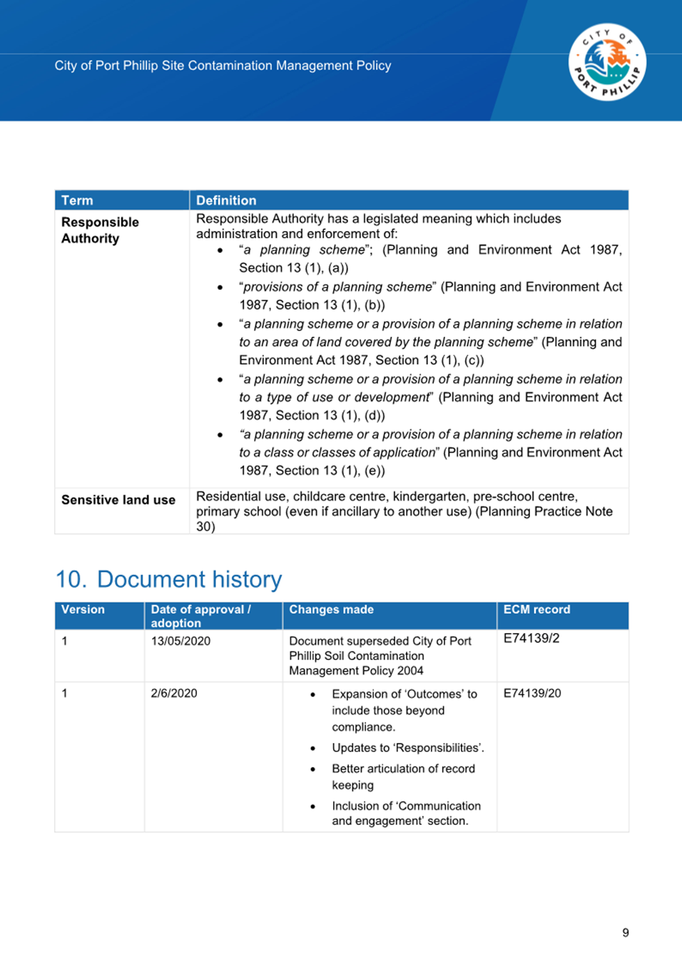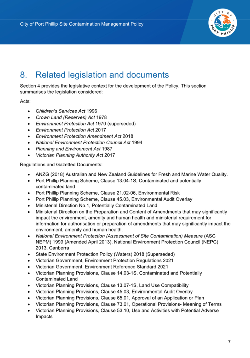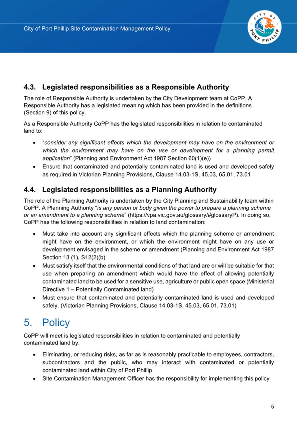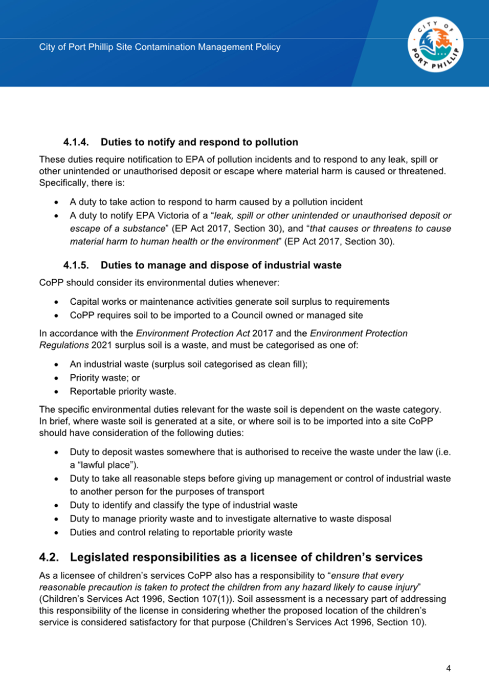 2.2.2 Legislated Responsibilities: The 2020 Policy focussed on Council's obligations regarding contaminated land in relation to the Environment Protection Act 2017. Council also has legislated responsibilities in relation to contaminated land under as a Responsible Authority and Planning Authority under the Planning and Environment Act 1987 and a children’s services licensee under the Children’s Services Act 1995, Section 107(1). The 2025 Policy has been updated to include these responsibilities.