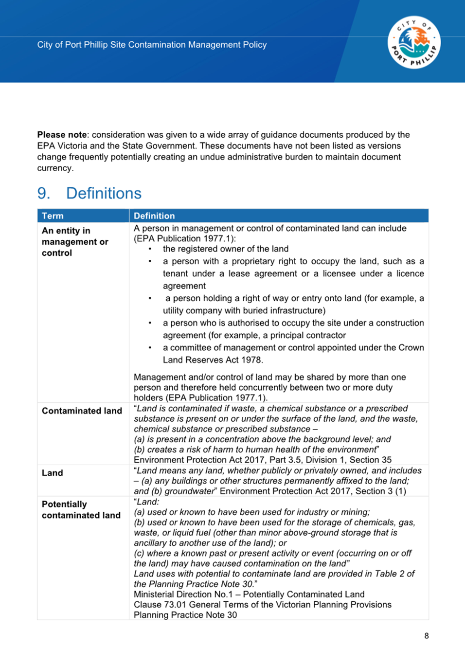 4.3 Council endorsed its first Site Contamination Management Policy (Policy) in 2004. The 2004 Policy was prepared under the legislative environment of the Environment Protection Act 1970, which was the primary instrument by which the environment was protected in Victoria at this time.