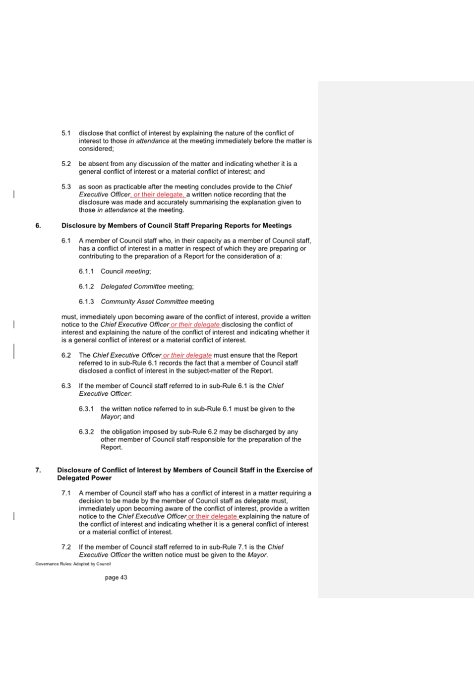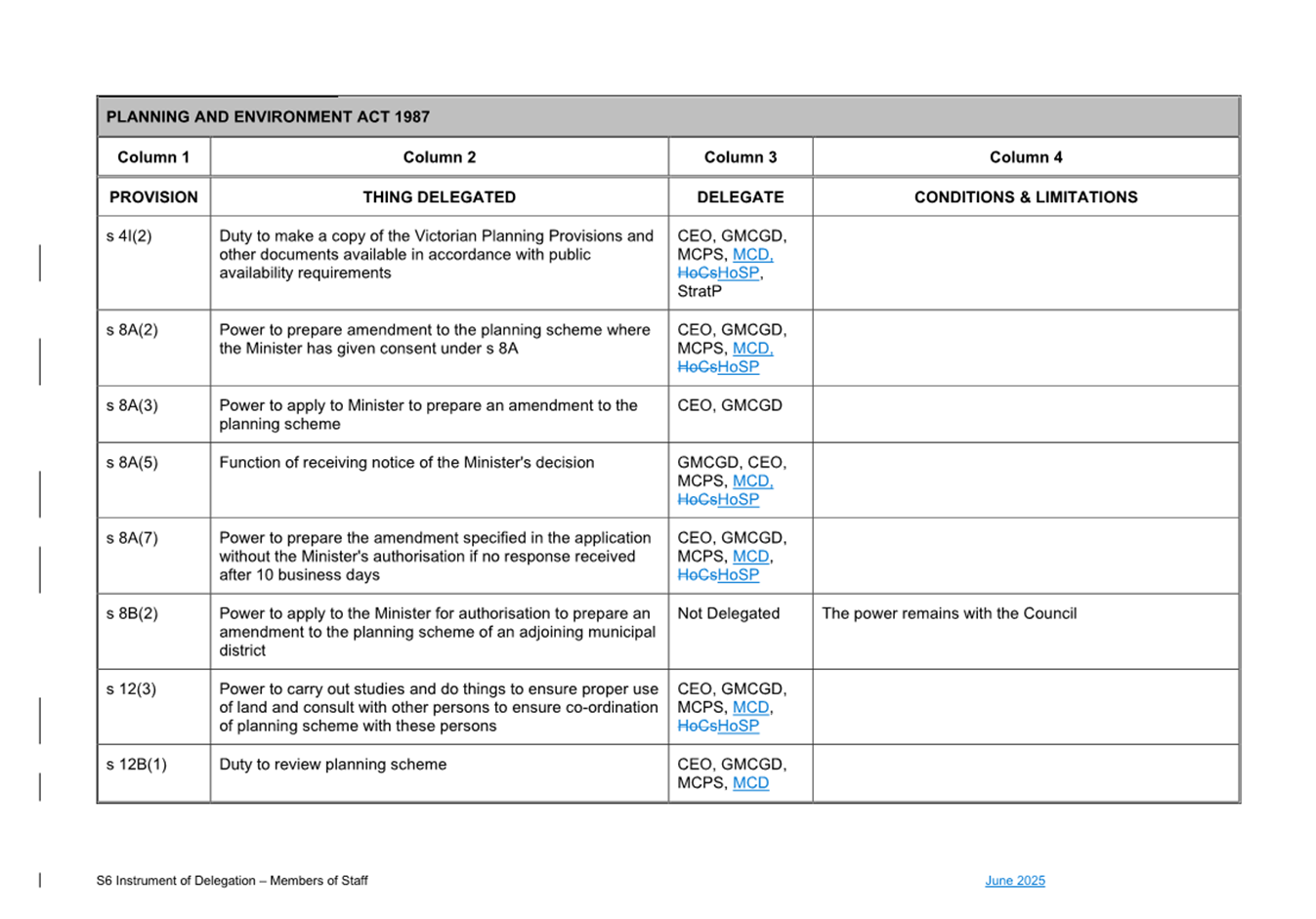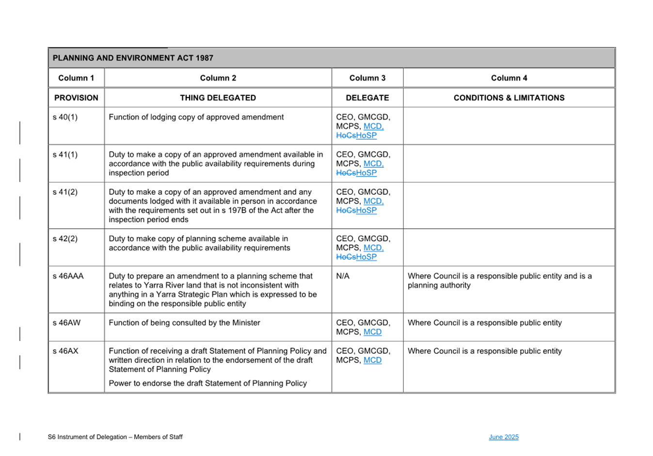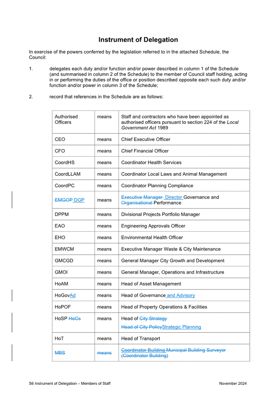 2.4 This report presents to Council the proposed changes to the existing S6 Instrument of Delegation from Council to Members of Council Staff as shown at Attachment 1.