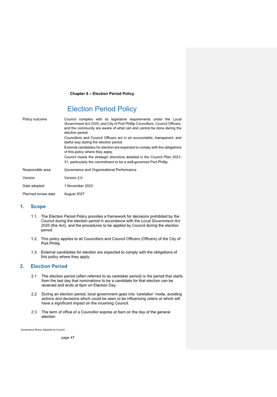 2.2.3 Document structure: The Policy was restructured to better align with the Policy Document Framework (Version 1.12, October 2023).