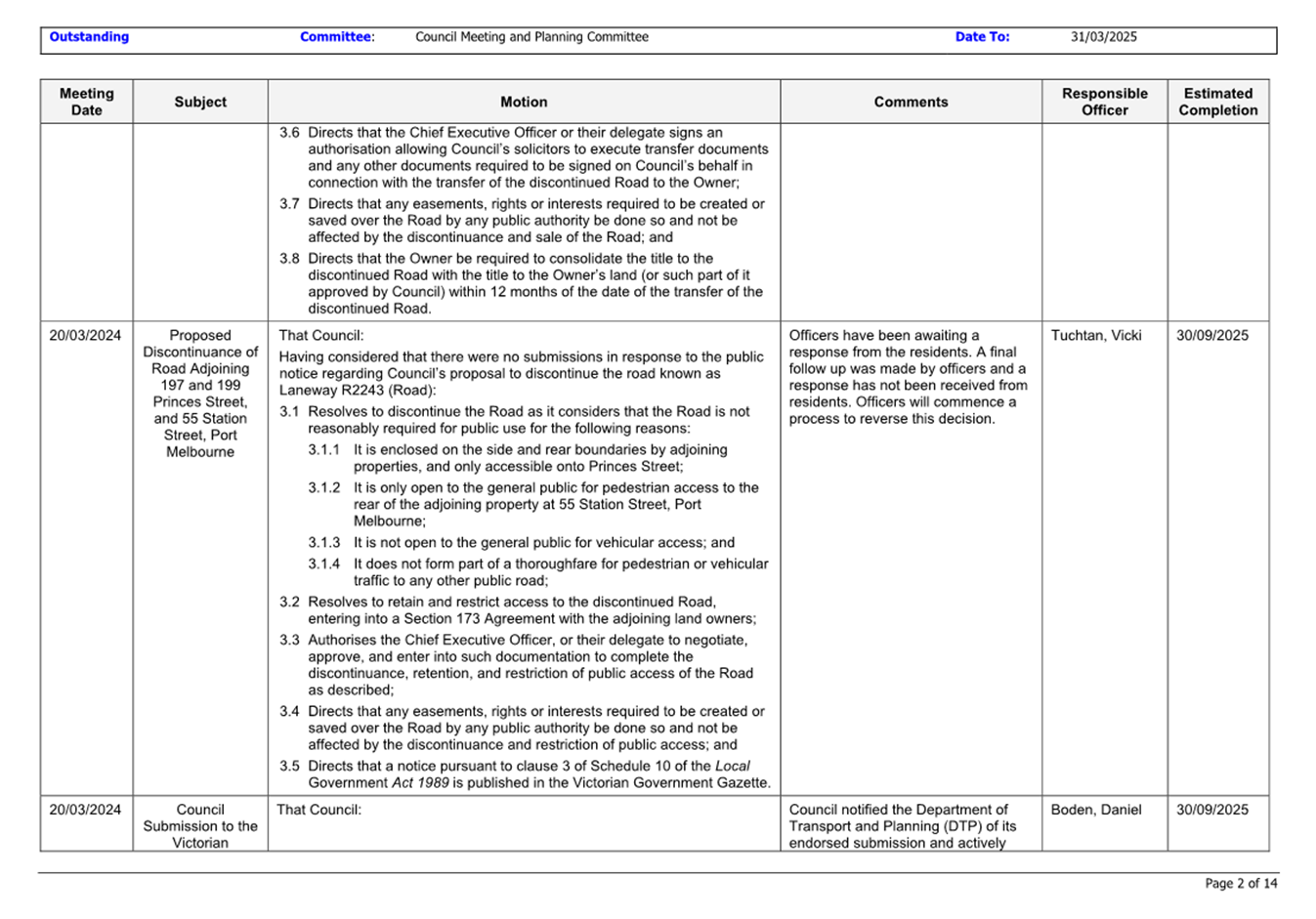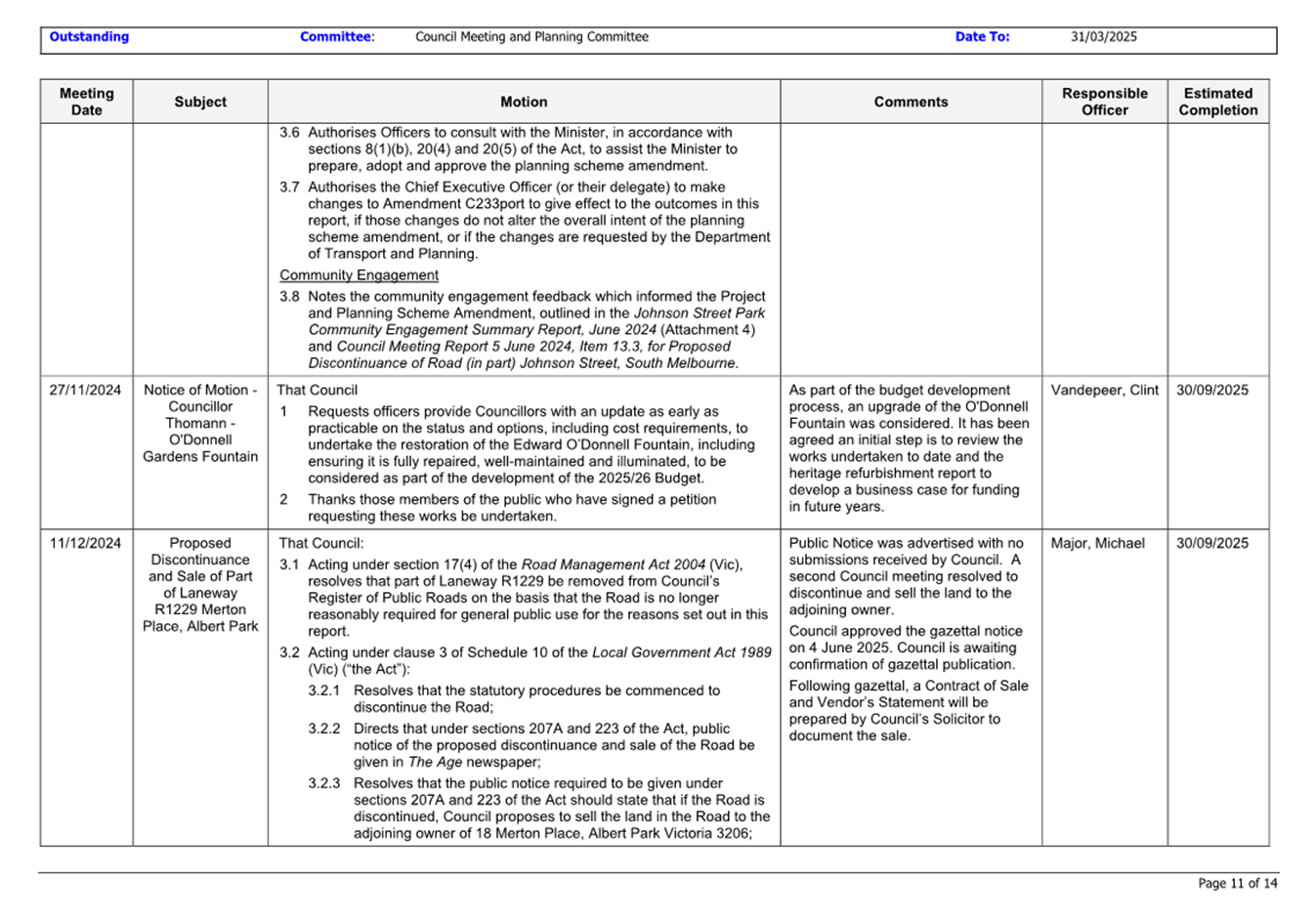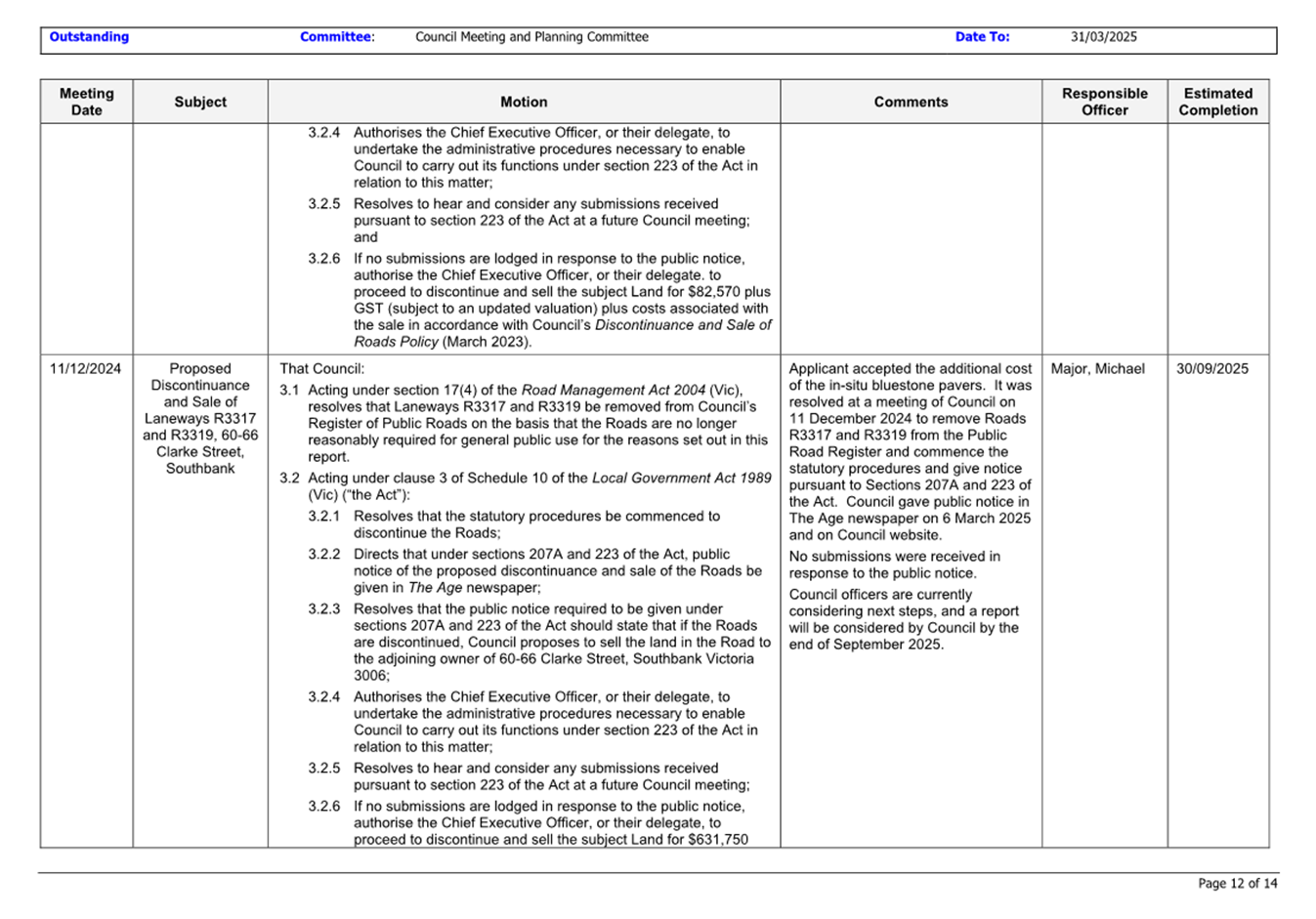 That Council: 3.1 Acting under section 17(4) of the Road Management Act 2004 (Vic), resolves that part of Road UNIP01-10 be removed from Council’s Register of Public Roads on the basis that the Road is no longer reasonably required for general public use for the reasons set out in this report. 3.2 Acting under clause 3 of Schedule 10 of the Local Government Act 1989 (Vic) (“the Act”): 3.2.1 Resolves that the statutory procedures be commenced to discontinue the Road; 3.2.2 Directs that under sections 207A and 223 of the Act, public notice of the proposed discontinuance and sale of the Road be given in The Age newspaper; 3.2.3 Resolves that the public notice required to be given under sections 207A and 223 of the Act should state that if the Road is discontinued, Council proposes to sell the land in the Road to the adjoining owner of 154-158 Bank Street, South Melbourne, Victoria 3205; 3.2.4 Authorises the Chief Executive Officer or delegate to undertake the administrative procedures necessary to enable Council to carry out its functions under section 223 of the Act in relation to this matter; and 3.2.5 Resolves to hear and consider any submissions received pursuant to section 223 of the Act at a future Council meeting. |