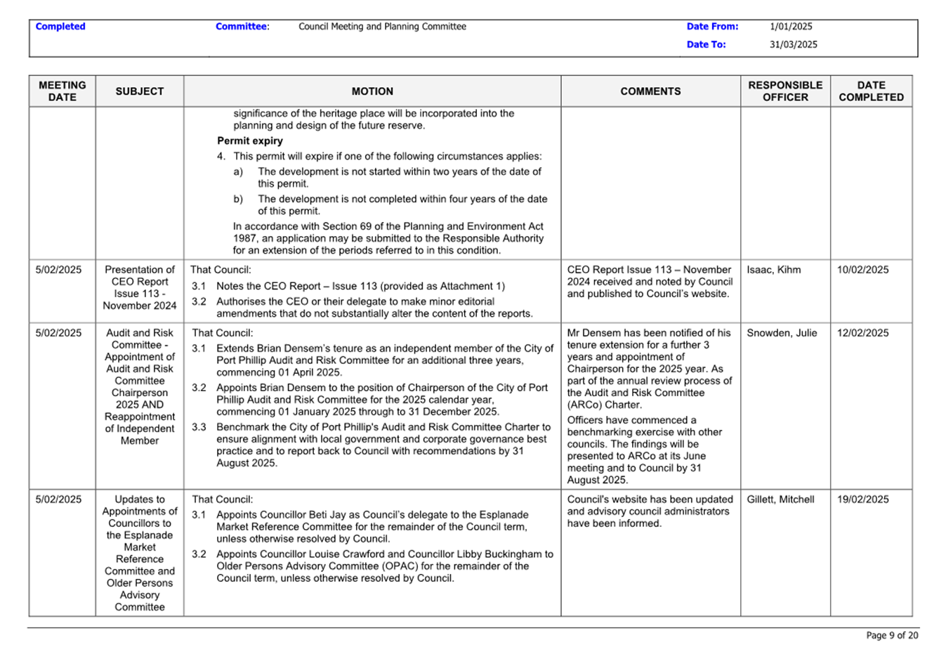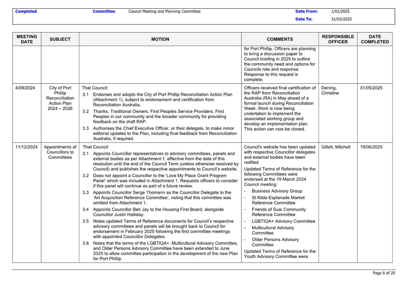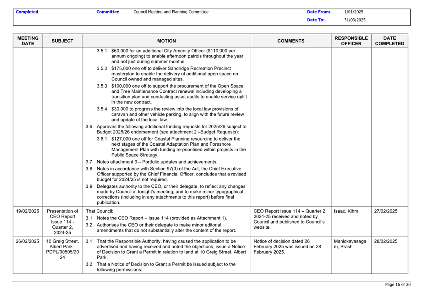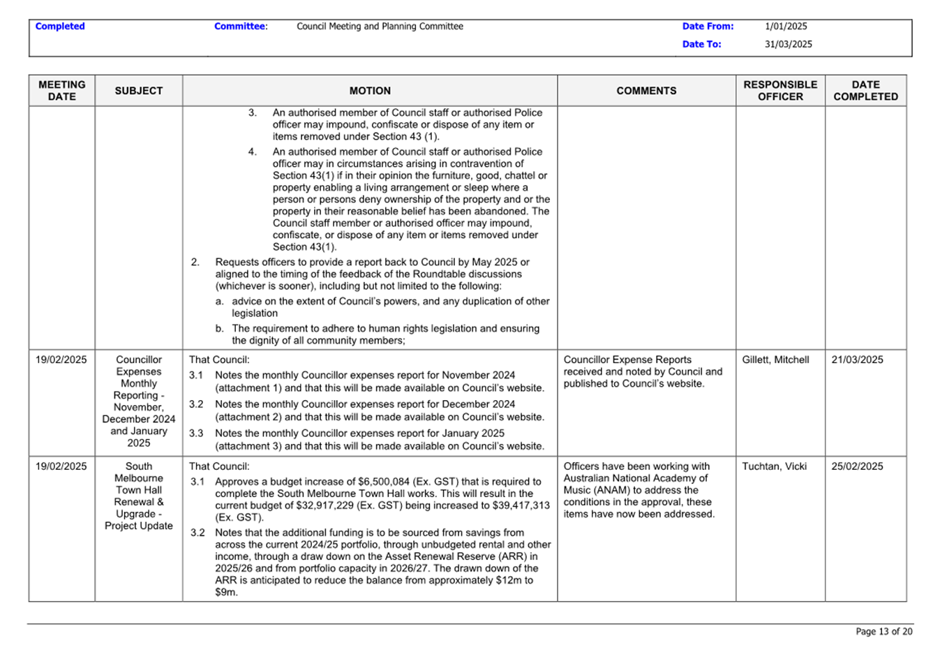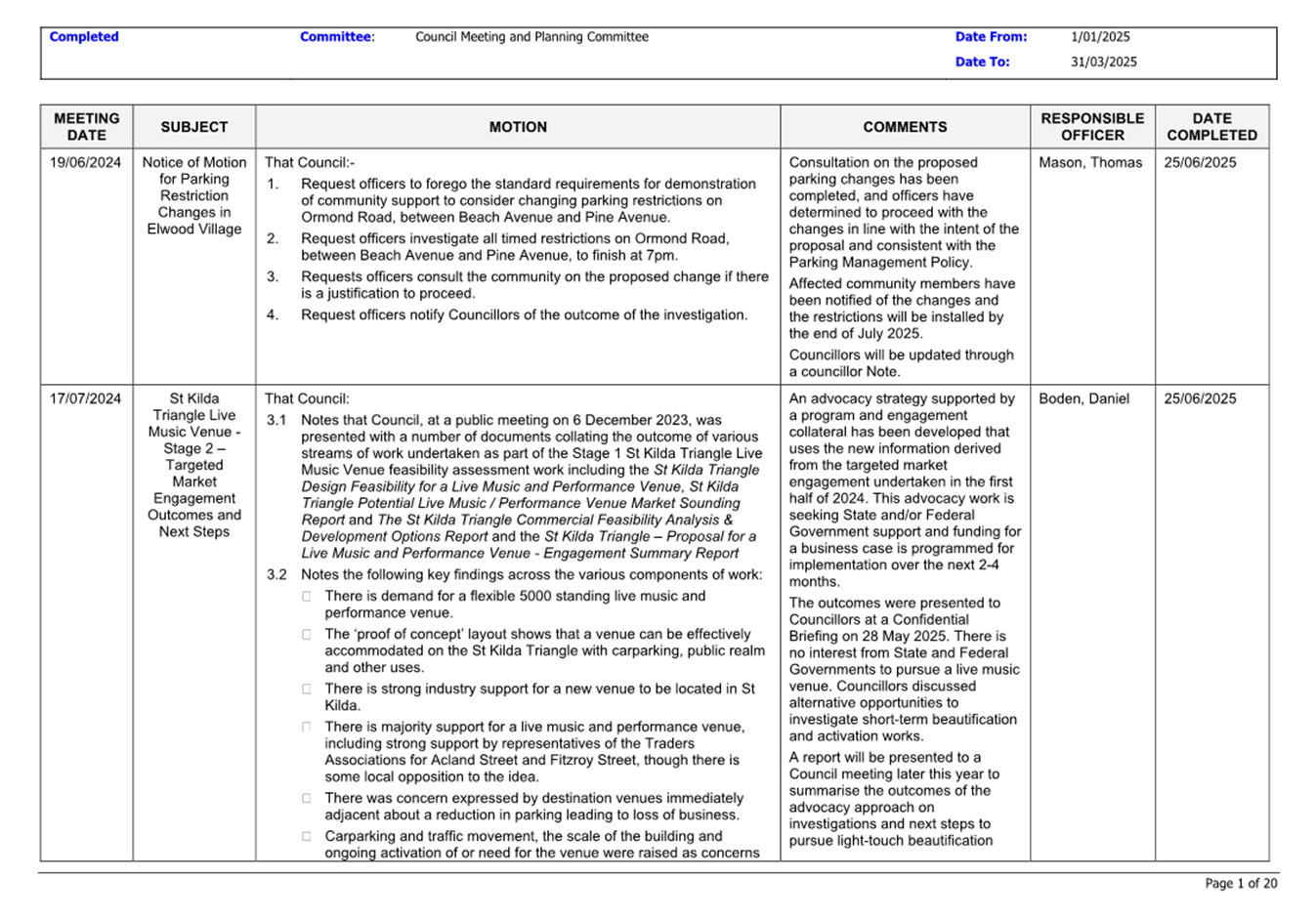 13.3 Status of Council Decisions and Questions taken on Notice Recorded by Council: 1 January to 31 March 2025.......................................................................... 230
