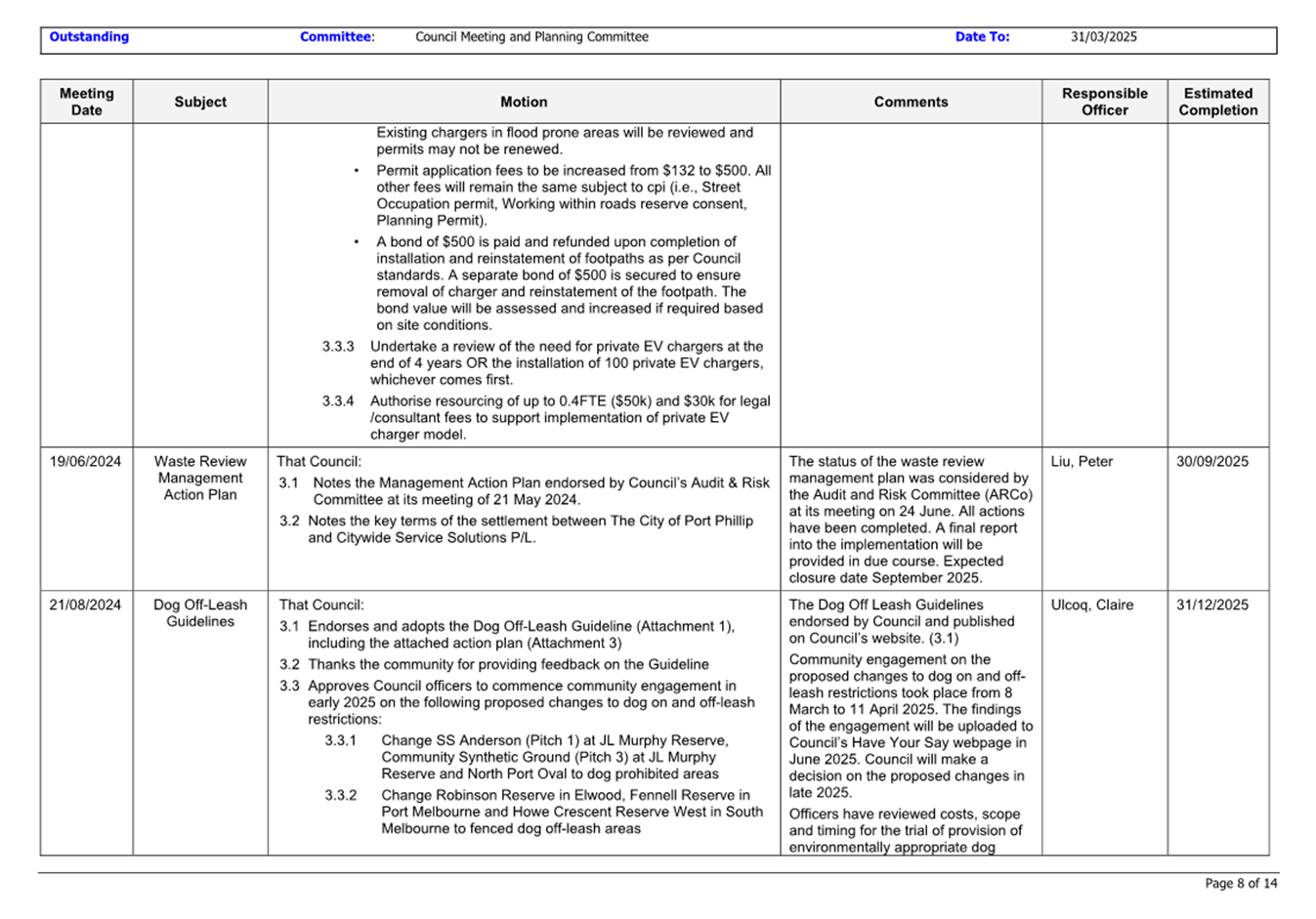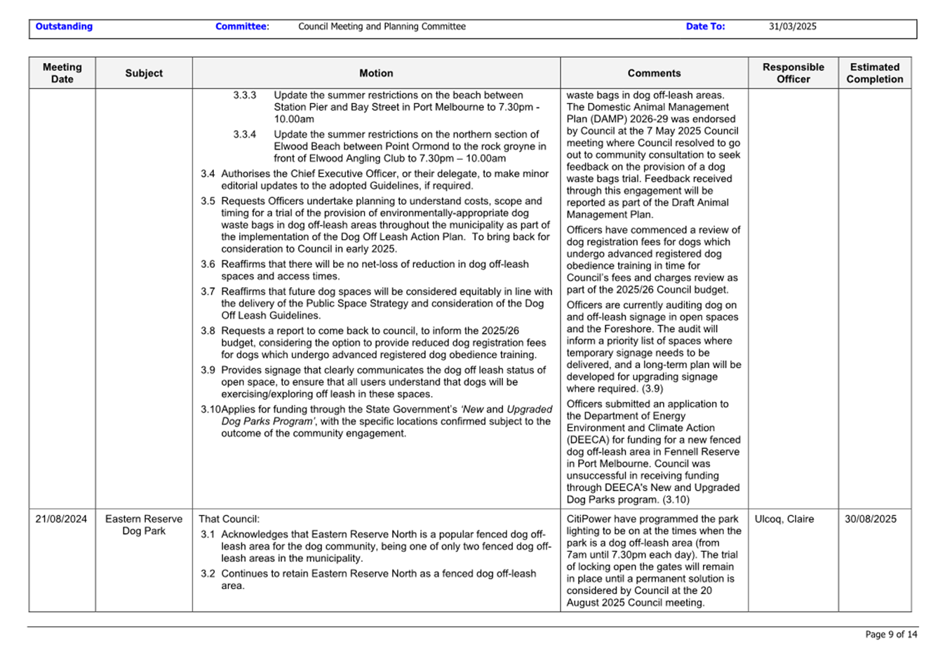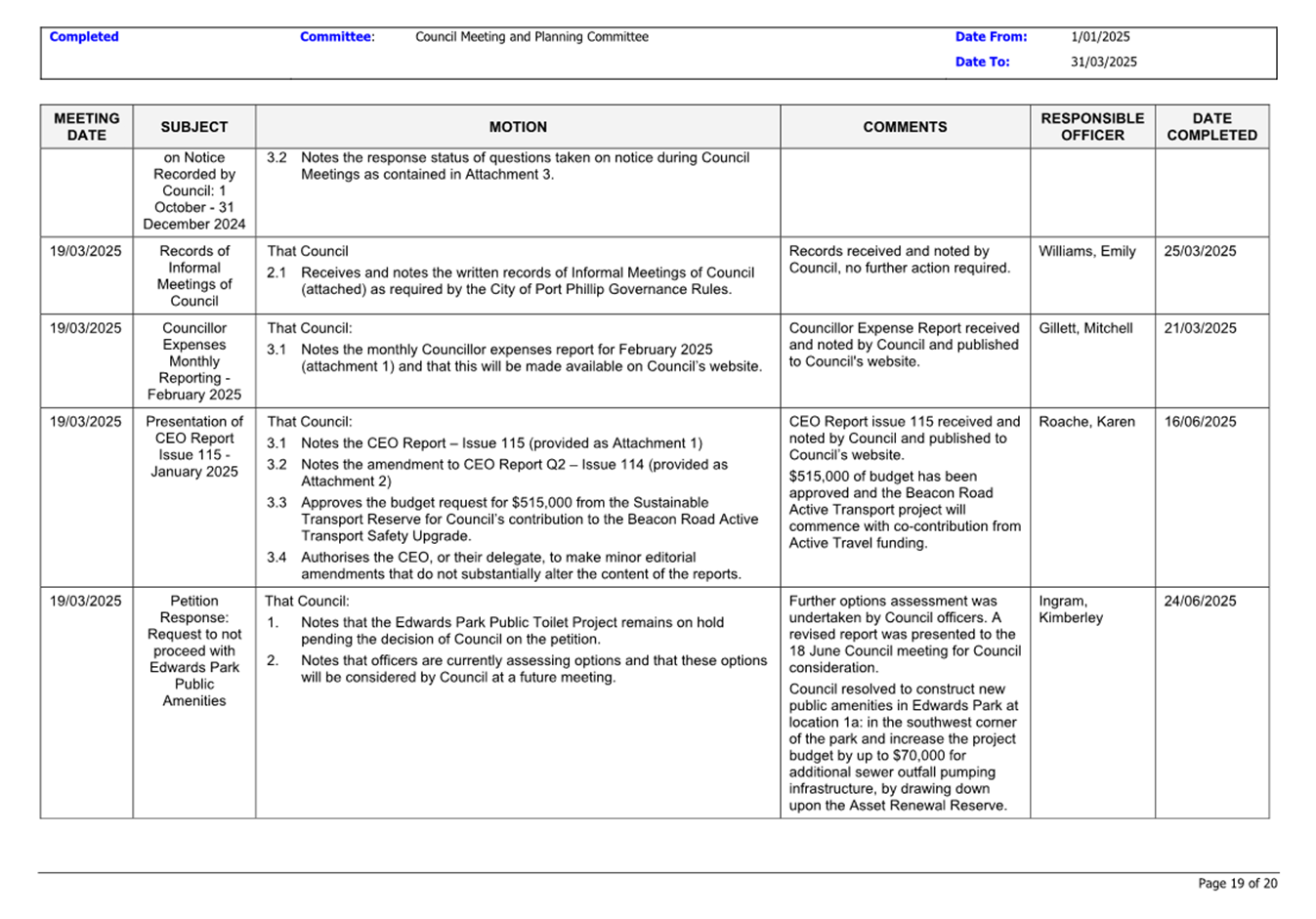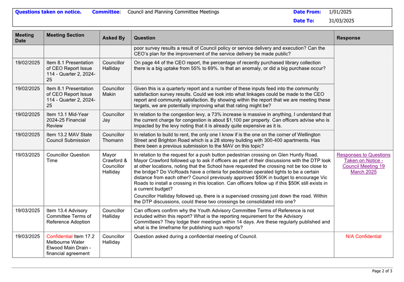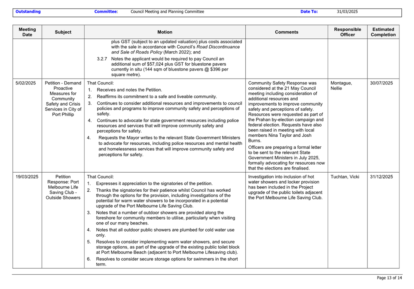 13.3 Status of Council Decisions and Questions taken on Notice Recorded by Council: 1 January to 31 March 2025.......................................................................... 230