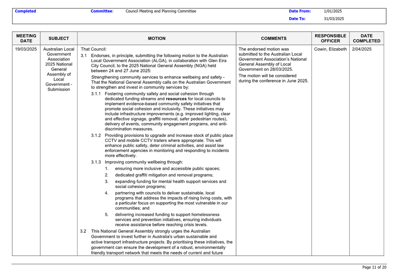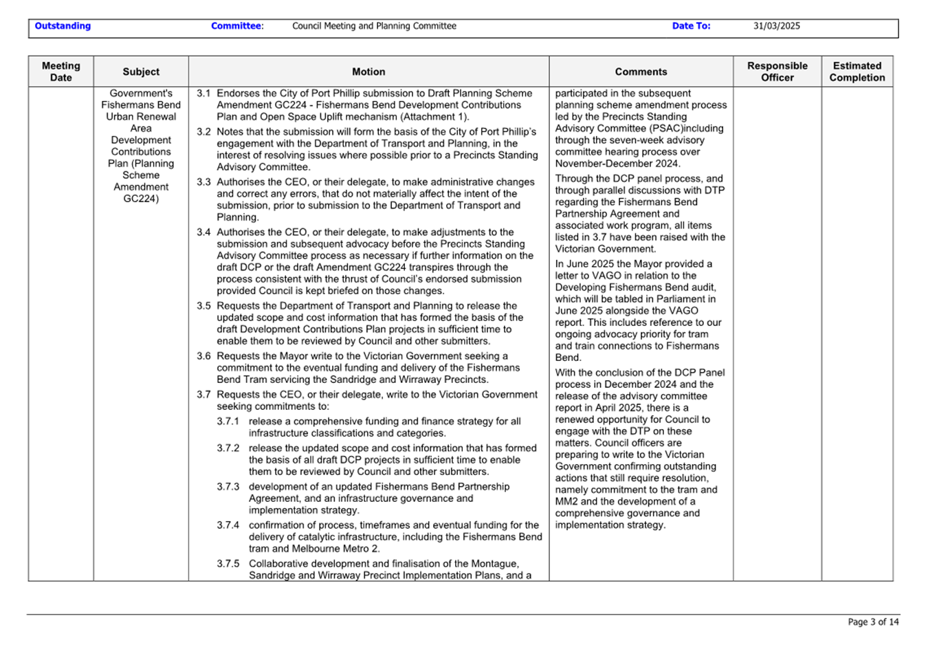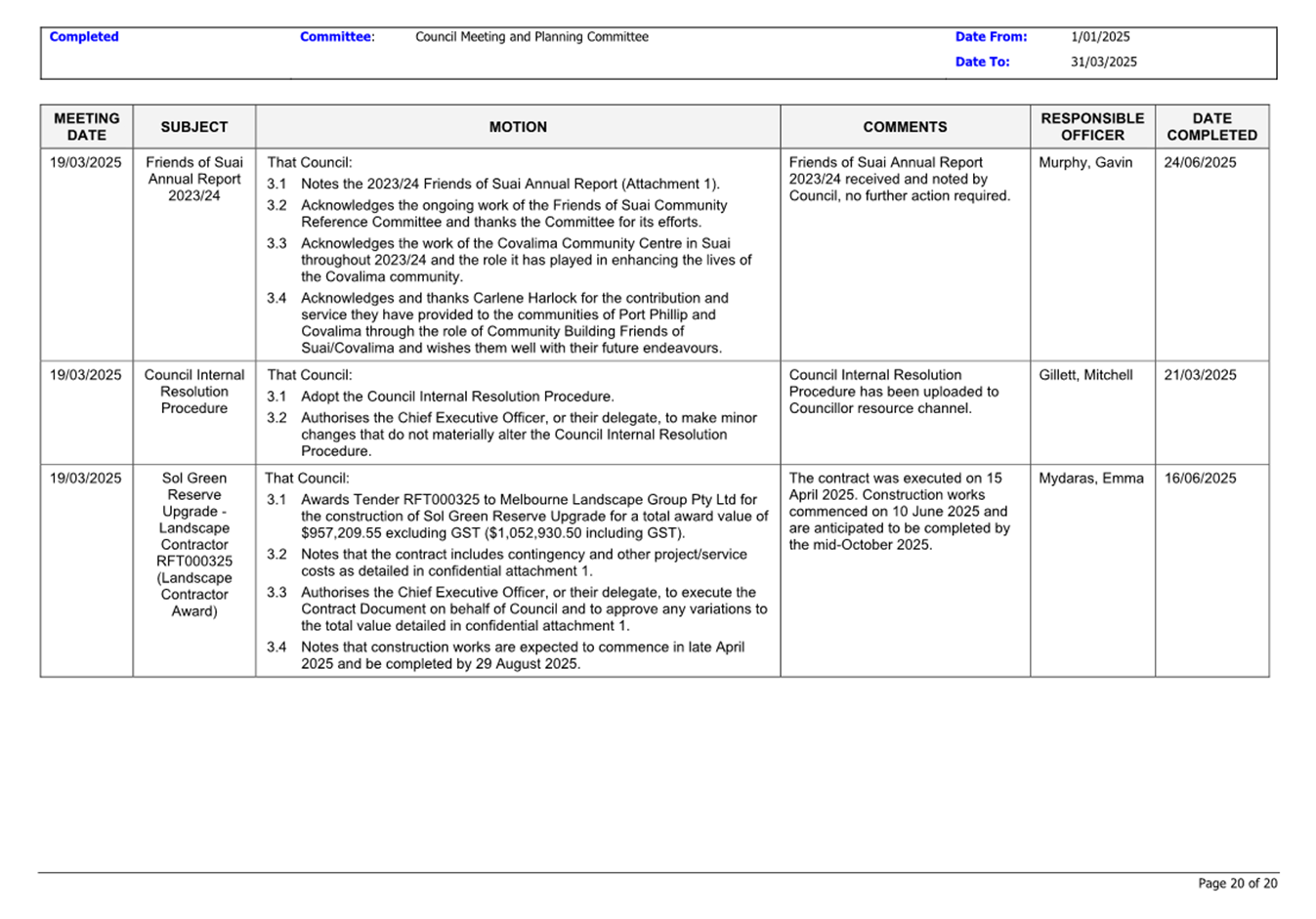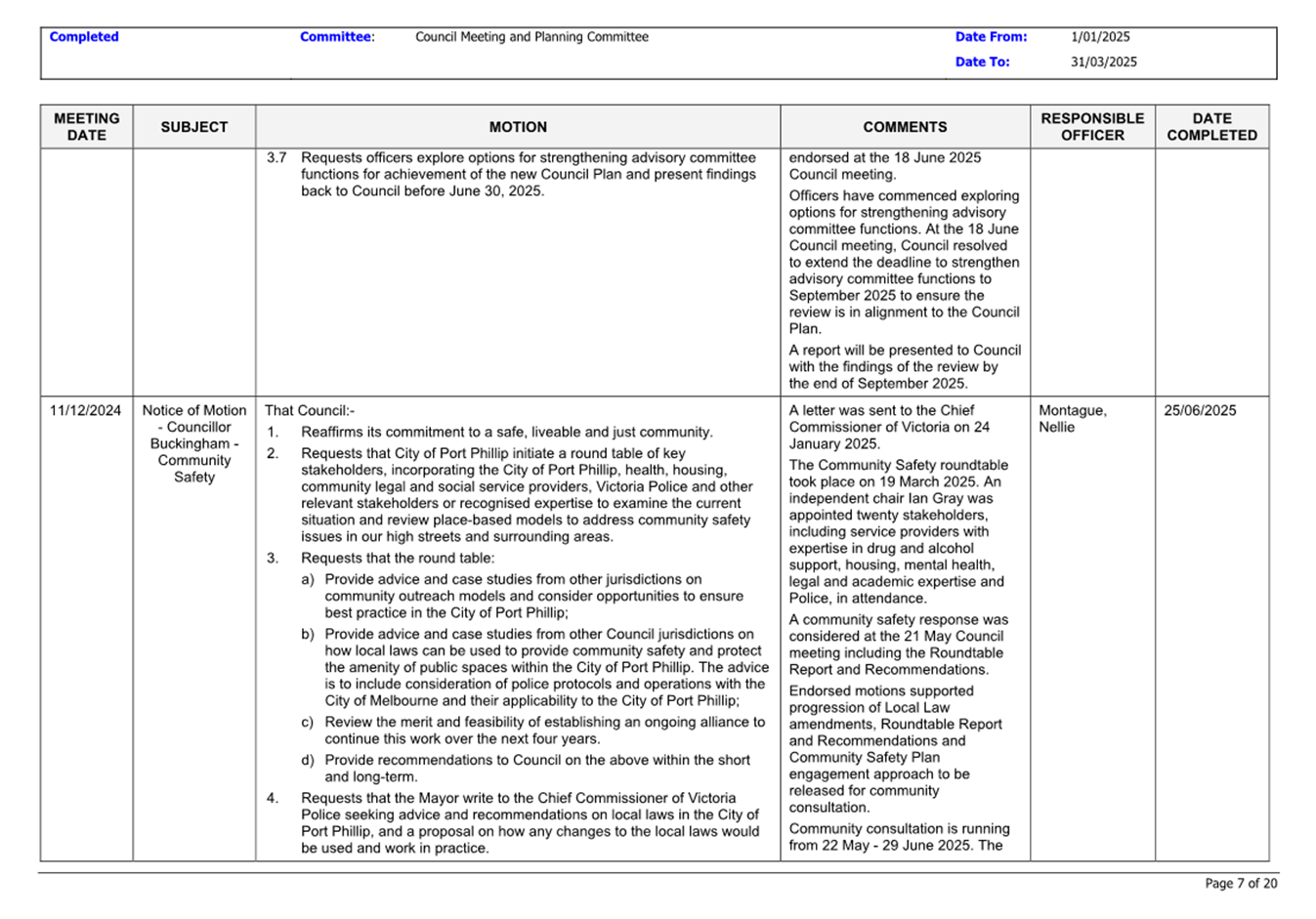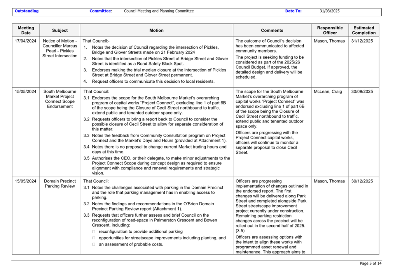 13.3 Status of Council Decisions and Questions taken on Notice Recorded by Council: 1 January to 31 March 2025.......................................................................... 230