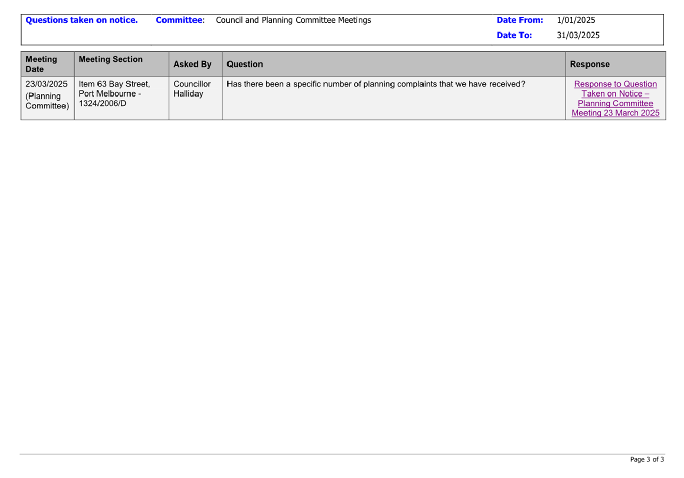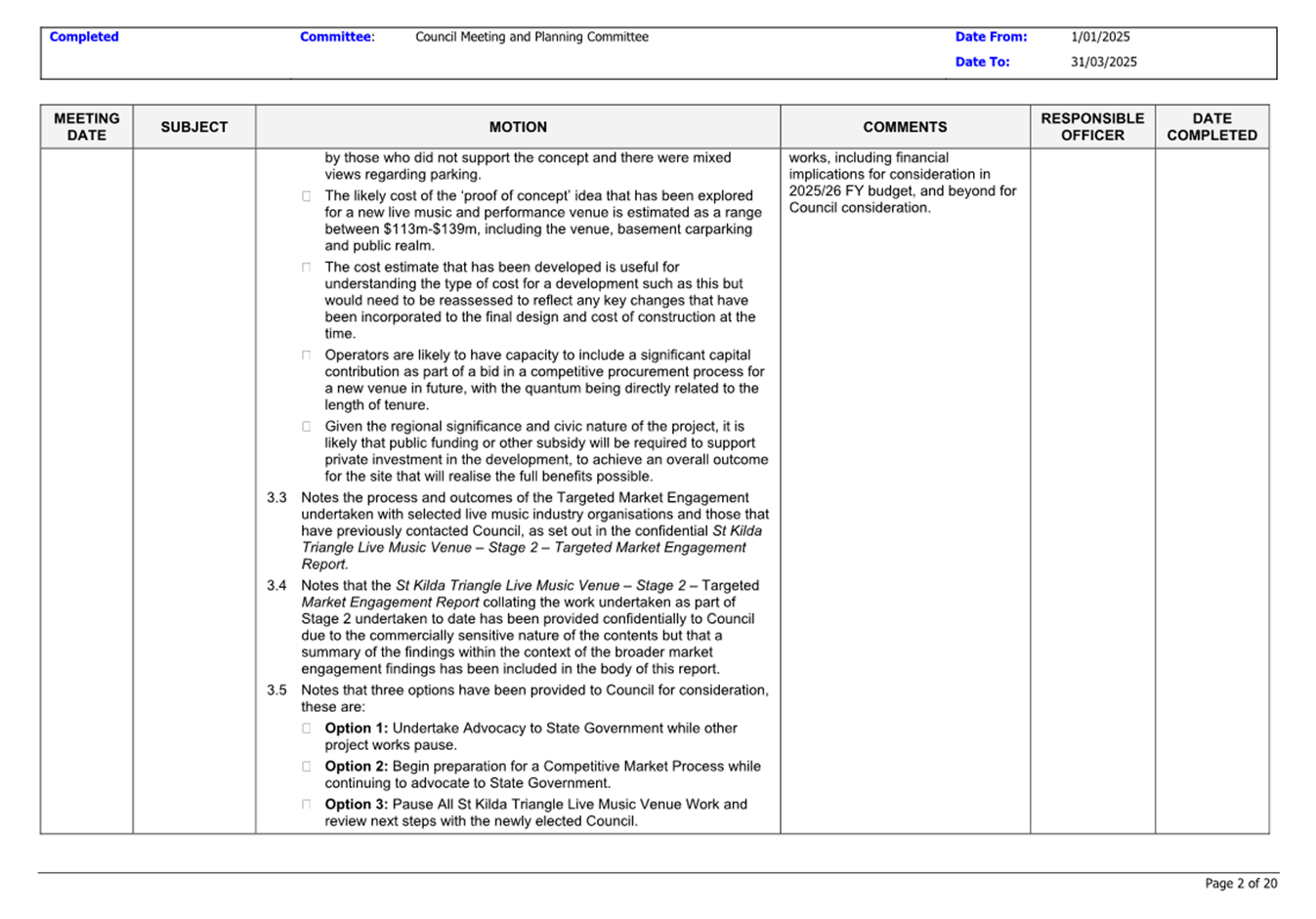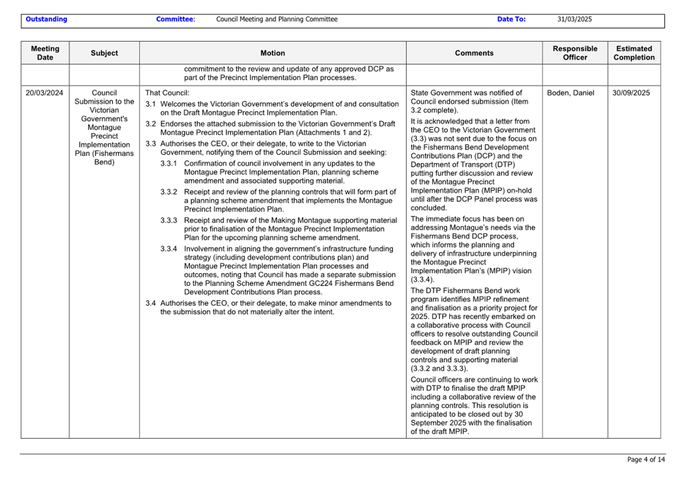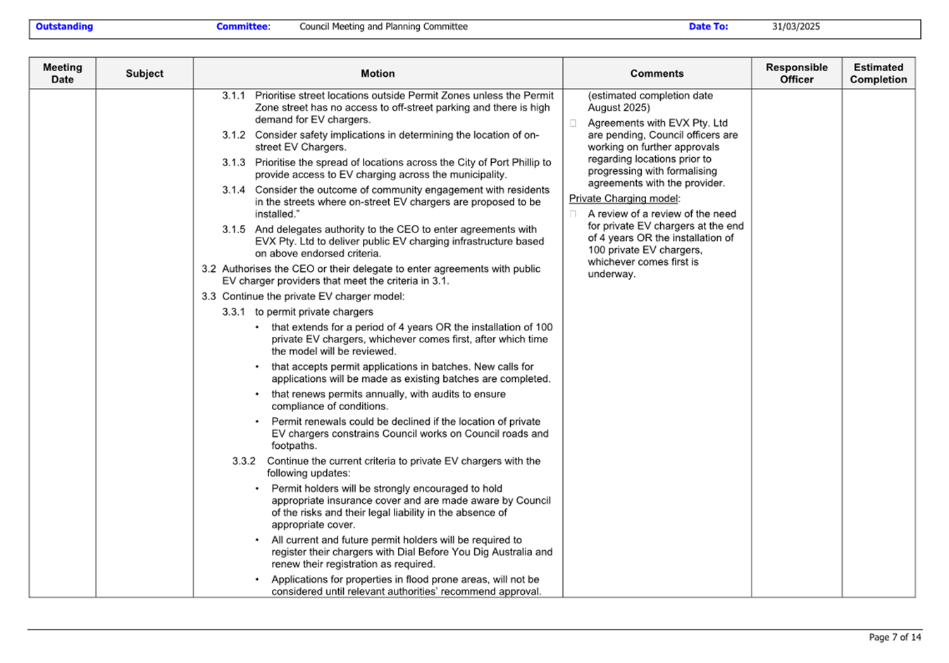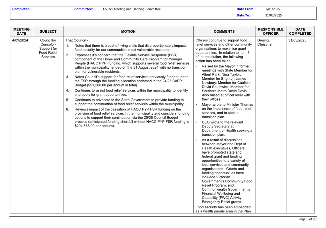 13.3 Status of Council Decisions and Questions taken on Notice Recorded by Council: 1 January to 31 March 2025.......................................................................... 230