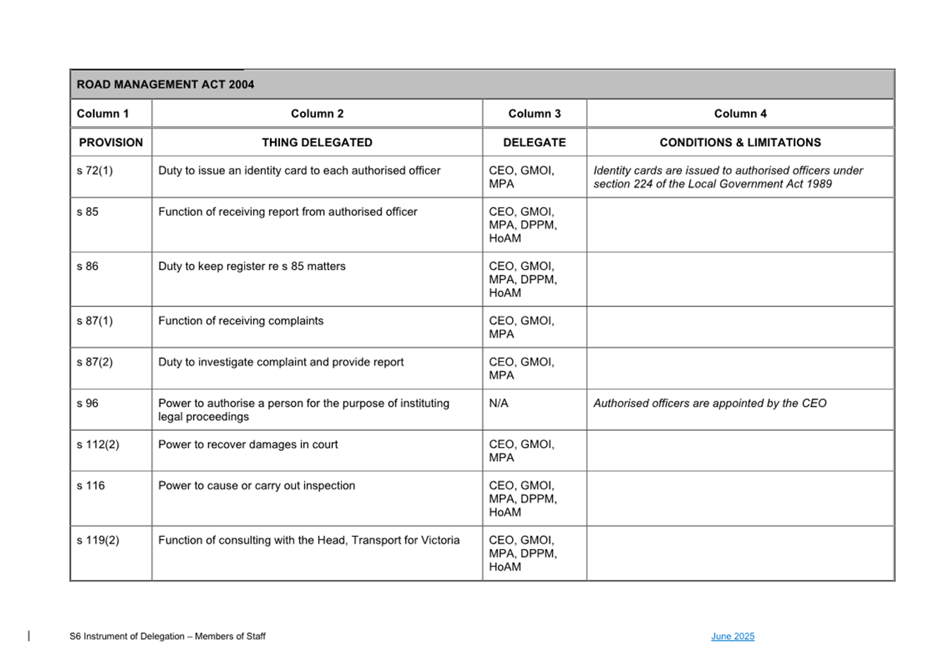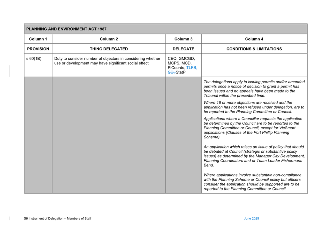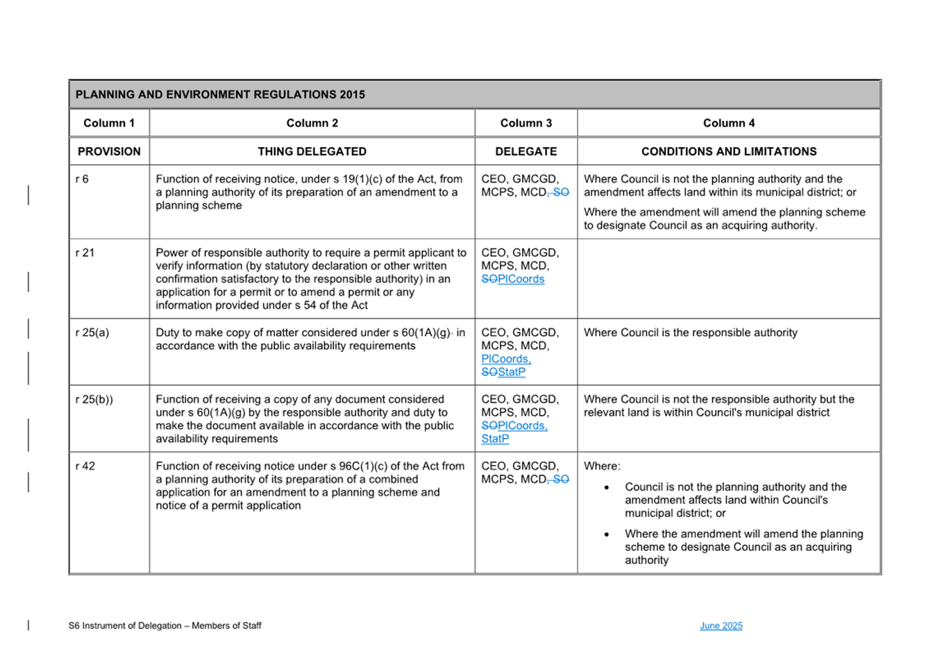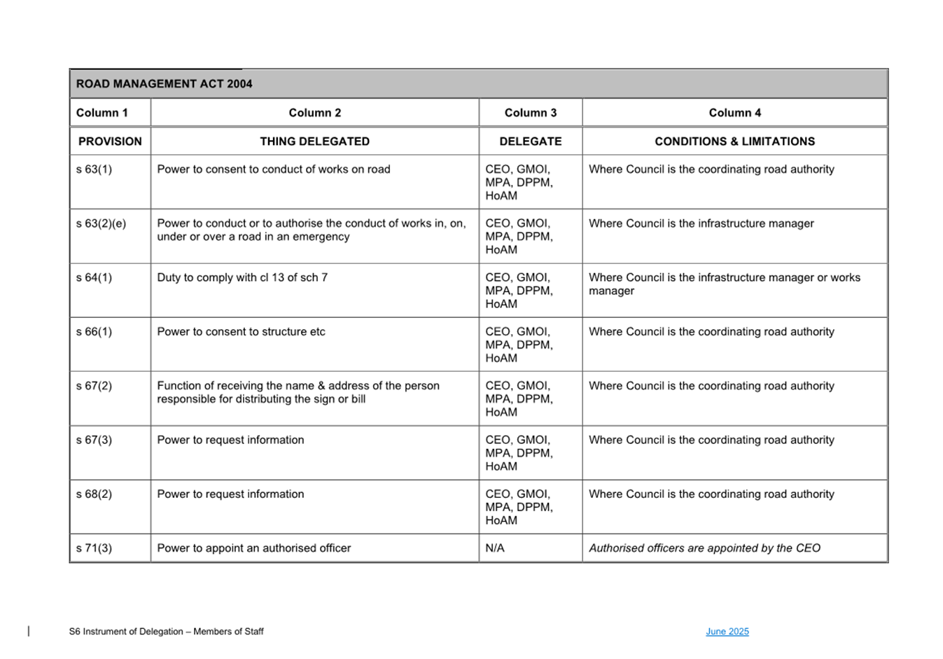 That Council: 3.1 Delegates to the members of Council staff holding, acting in or performing the duties of the offices or positions referred to in the S6 Instrument of Delegation from Council to Members of Council Staff (Attachment 1) the powers, duties and functions set out in that Instrument, subject to the conditions and limitations specified in that instrument. 3.2 The Common Seal of Council be affixed to the S6 Instrument of Delegation from Council to Members of Council Staff. 3.3 The S6 Instrument of Delegation from Council to Members of Council Staff comes into force immediately from when the Common Seal of Council is affixed to the Instrument. 3.4 Notes that on the coming into force of the S6 Instrument of Delegation, the previous S6 Instrument of Delegation from Council to members of Council staff (authorised by resolution of Council on 27 November 2024) is revoked. 3.5 Notes that the duties and functions set out in the Instrument must be performed, and the powers set out in the Instrument of Delegation must be executed, in accordance with any policies of Council that it may from time to time adopt. 3.6 Authorises the CEO, or their delegate, to make administrative changes to the document to correct any titles and typographical errors, to enable the documents to be appropriately sealed. |
