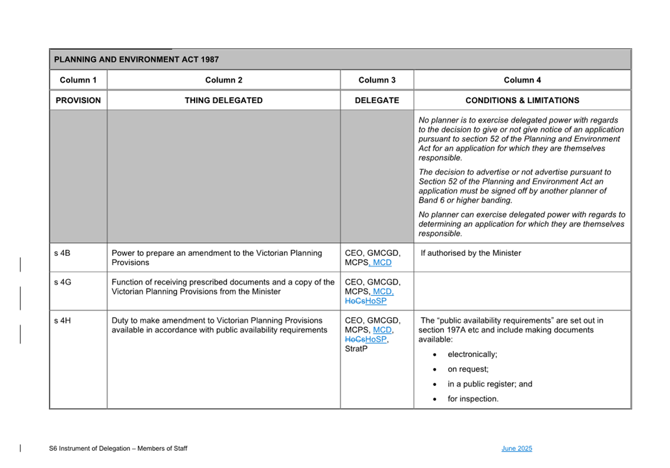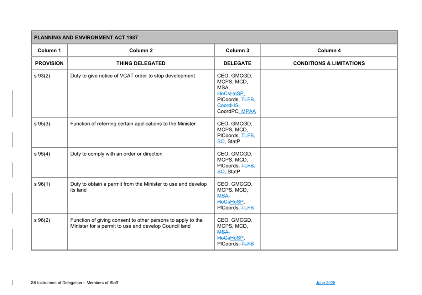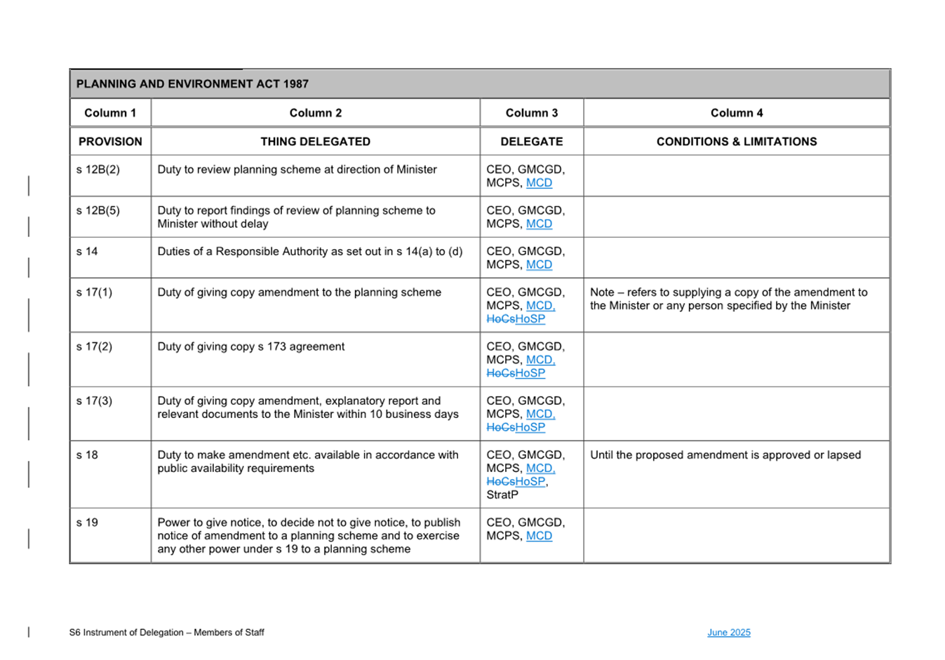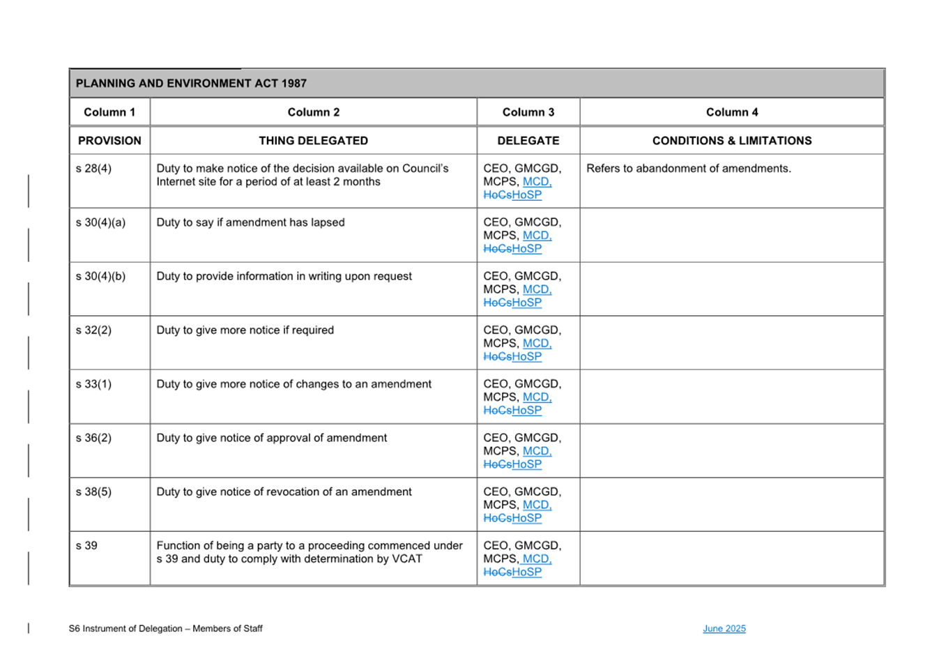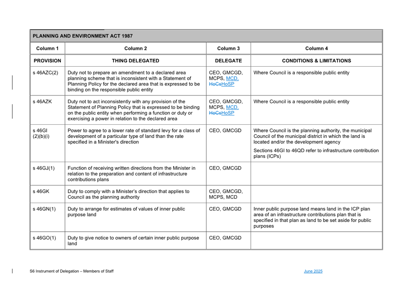 That Council: 3.1 Delegates to the members of Council staff holding, acting in or performing the duties of the offices or positions referred to in the S6 Instrument of Delegation from Council to Members of Council Staff (Attachment 1) the powers, duties and functions set out in that Instrument, subject to the conditions and limitations specified in that instrument. 3.2 The Common Seal of Council be affixed to the S6 Instrument of Delegation from Council to Members of Council Staff. 3.3 The S6 Instrument of Delegation from Council to Members of Council Staff comes into force immediately from when the Common Seal of Council is affixed to the Instrument. 3.4 Notes that on the coming into force of the S6 Instrument of Delegation, the previous S6 Instrument of Delegation from Council to members of Council staff (authorised by resolution of Council on 27 November 2024) is revoked. 3.5 Notes that the duties and functions set out in the Instrument must be performed, and the powers set out in the Instrument of Delegation must be executed, in accordance with any policies of Council that it may from time to time adopt. 3.6 Authorises the CEO, or their delegate, to make administrative changes to the document to correct any titles and typographical errors, to enable the documents to be appropriately sealed. |