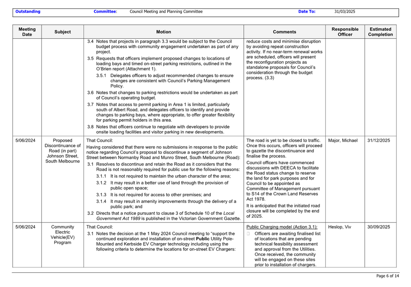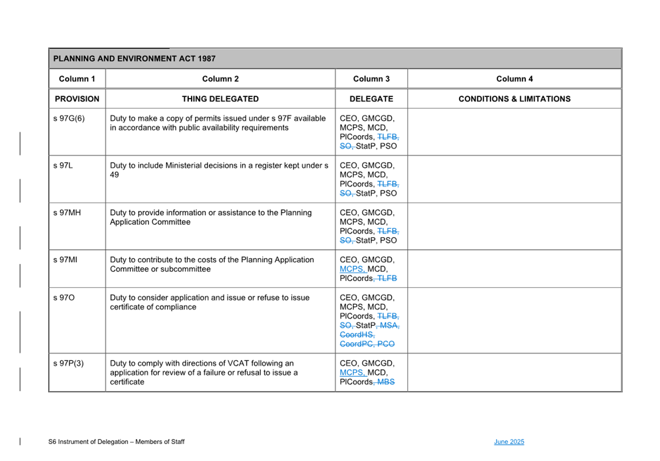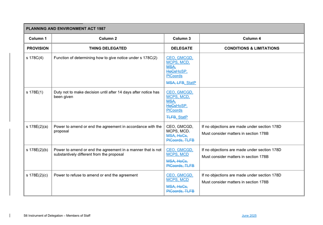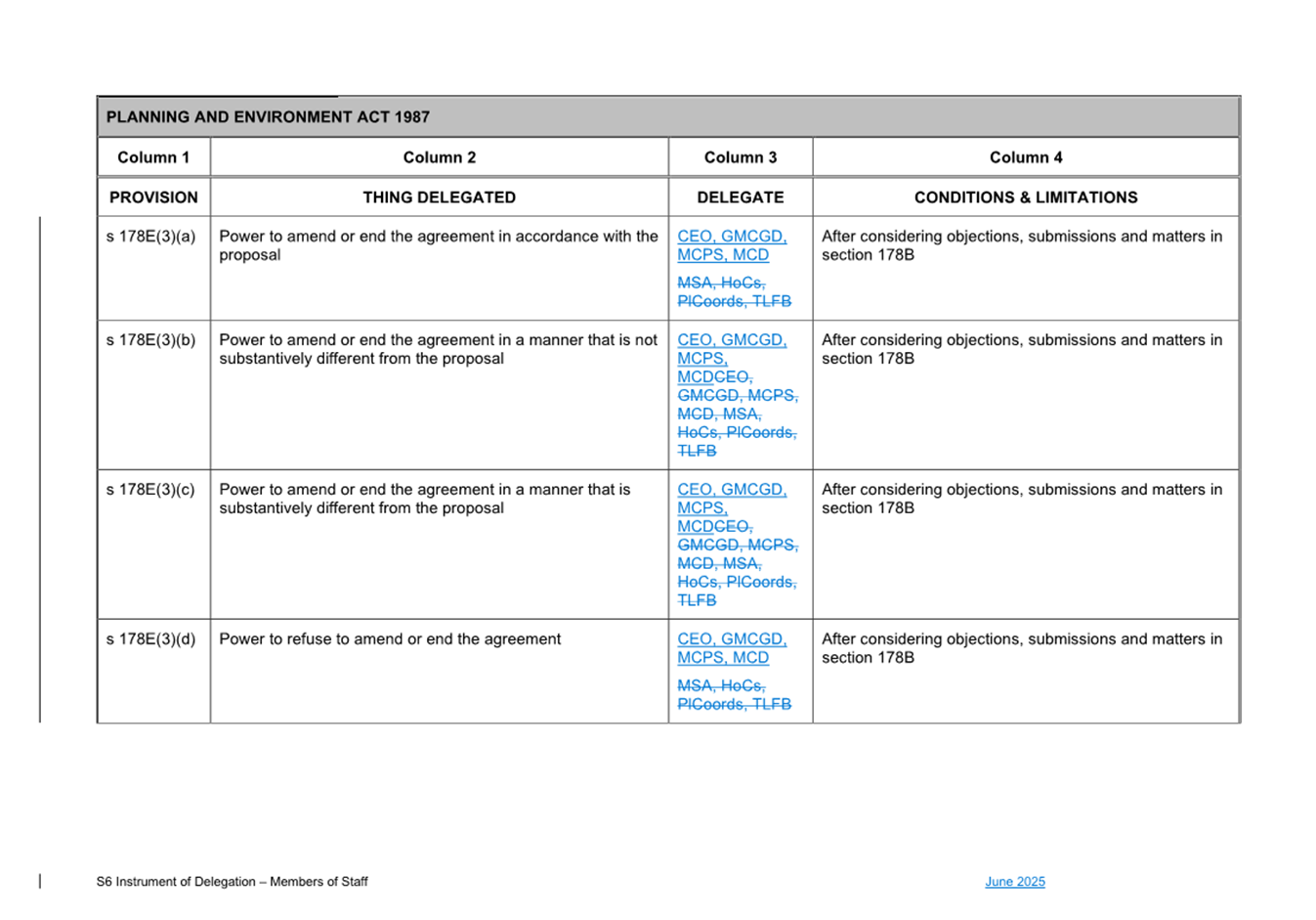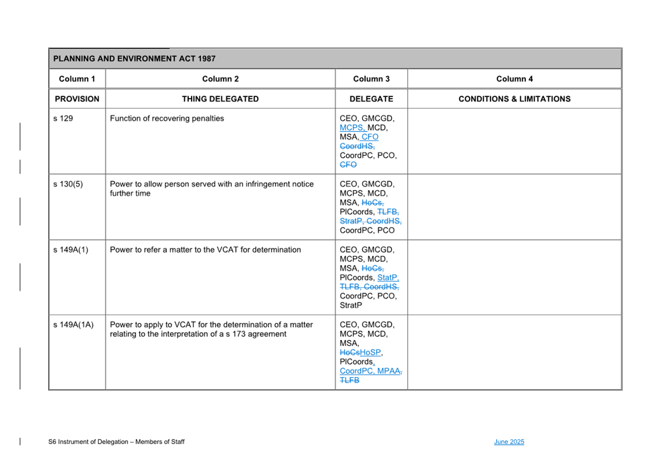 That Council: 3.1 Delegates to the members of Council staff holding, acting in or performing the duties of the offices or positions referred to in the S6 Instrument of Delegation from Council to Members of Council Staff (Attachment 1) the powers, duties and functions set out in that Instrument, subject to the conditions and limitations specified in that instrument. 3.2 The Common Seal of Council be affixed to the S6 Instrument of Delegation from Council to Members of Council Staff. 3.3 The S6 Instrument of Delegation from Council to Members of Council Staff comes into force immediately from when the Common Seal of Council is affixed to the Instrument. 3.4 Notes that on the coming into force of the S6 Instrument of Delegation, the previous S6 Instrument of Delegation from Council to members of Council staff (authorised by resolution of Council on 27 November 2024) is revoked. 3.5 Notes that the duties and functions set out in the Instrument must be performed, and the powers set out in the Instrument of Delegation must be executed, in accordance with any policies of Council that it may from time to time adopt. 3.6 Authorises the CEO, or their delegate, to make administrative changes to the document to correct any titles and typographical errors, to enable the documents to be appropriately sealed. |