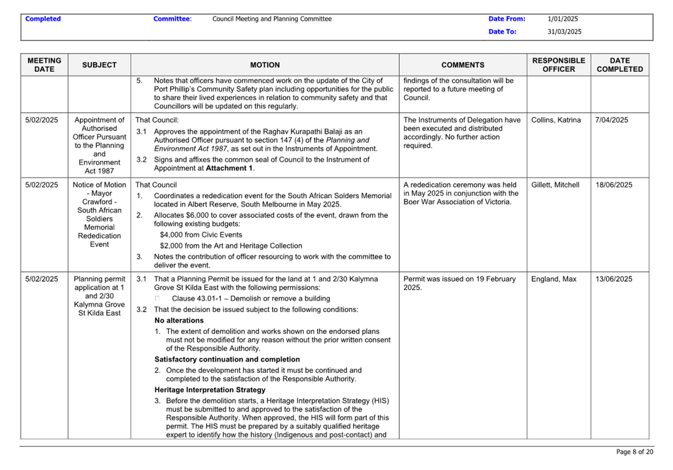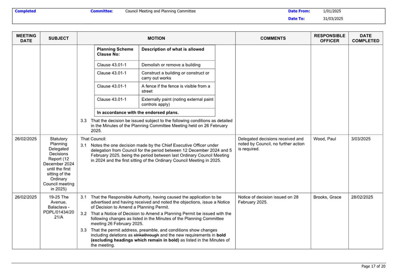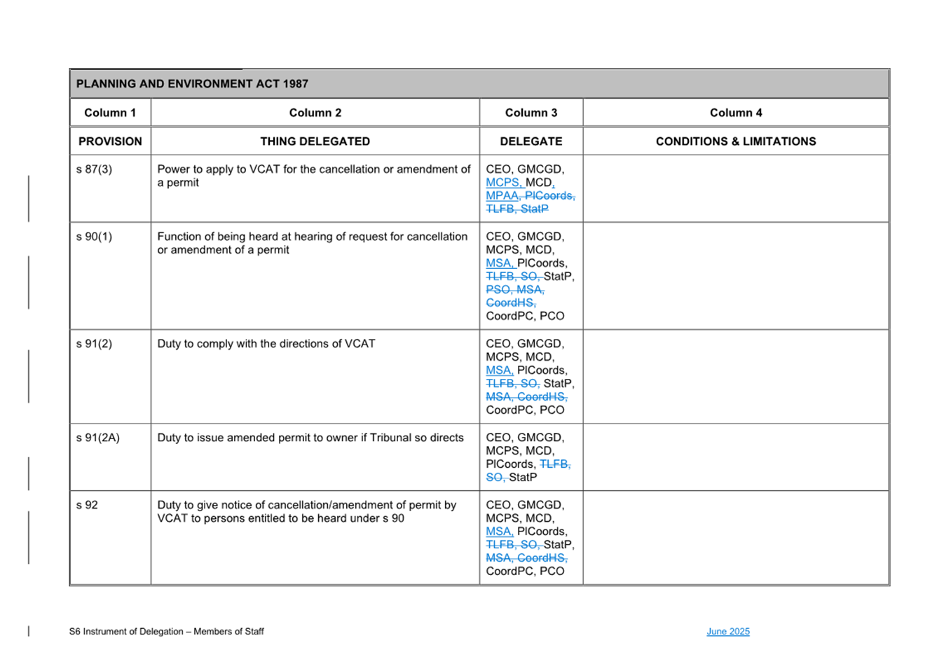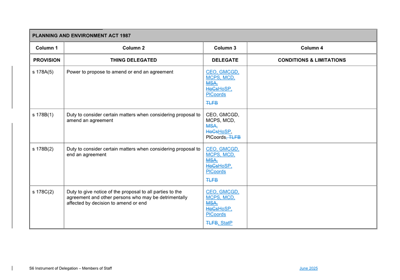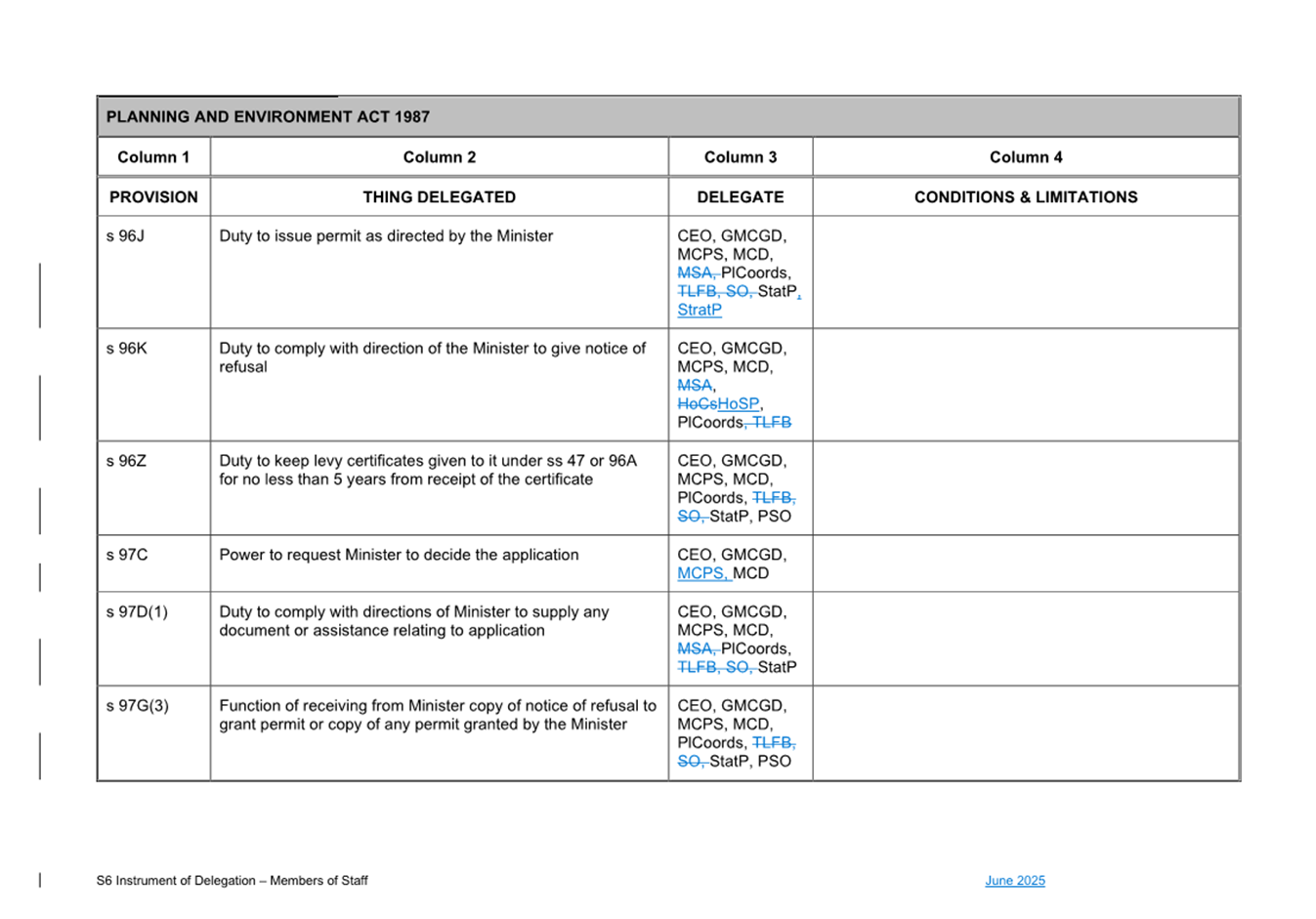 That Council: 3.1 Delegates to the members of Council staff holding, acting in or performing the duties of the offices or positions referred to in the S6 Instrument of Delegation from Council to Members of Council Staff (Attachment 1) the powers, duties and functions set out in that Instrument, subject to the conditions and limitations specified in that instrument. 3.2 The Common Seal of Council be affixed to the S6 Instrument of Delegation from Council to Members of Council Staff. 3.3 The S6 Instrument of Delegation from Council to Members of Council Staff comes into force immediately from when the Common Seal of Council is affixed to the Instrument. 3.4 Notes that on the coming into force of the S6 Instrument of Delegation, the previous S6 Instrument of Delegation from Council to members of Council staff (authorised by resolution of Council on 27 November 2024) is revoked. 3.5 Notes that the duties and functions set out in the Instrument must be performed, and the powers set out in the Instrument of Delegation must be executed, in accordance with any policies of Council that it may from time to time adopt. 3.6 Authorises the CEO, or their delegate, to make administrative changes to the document to correct any titles and typographical errors, to enable the documents to be appropriately sealed. |