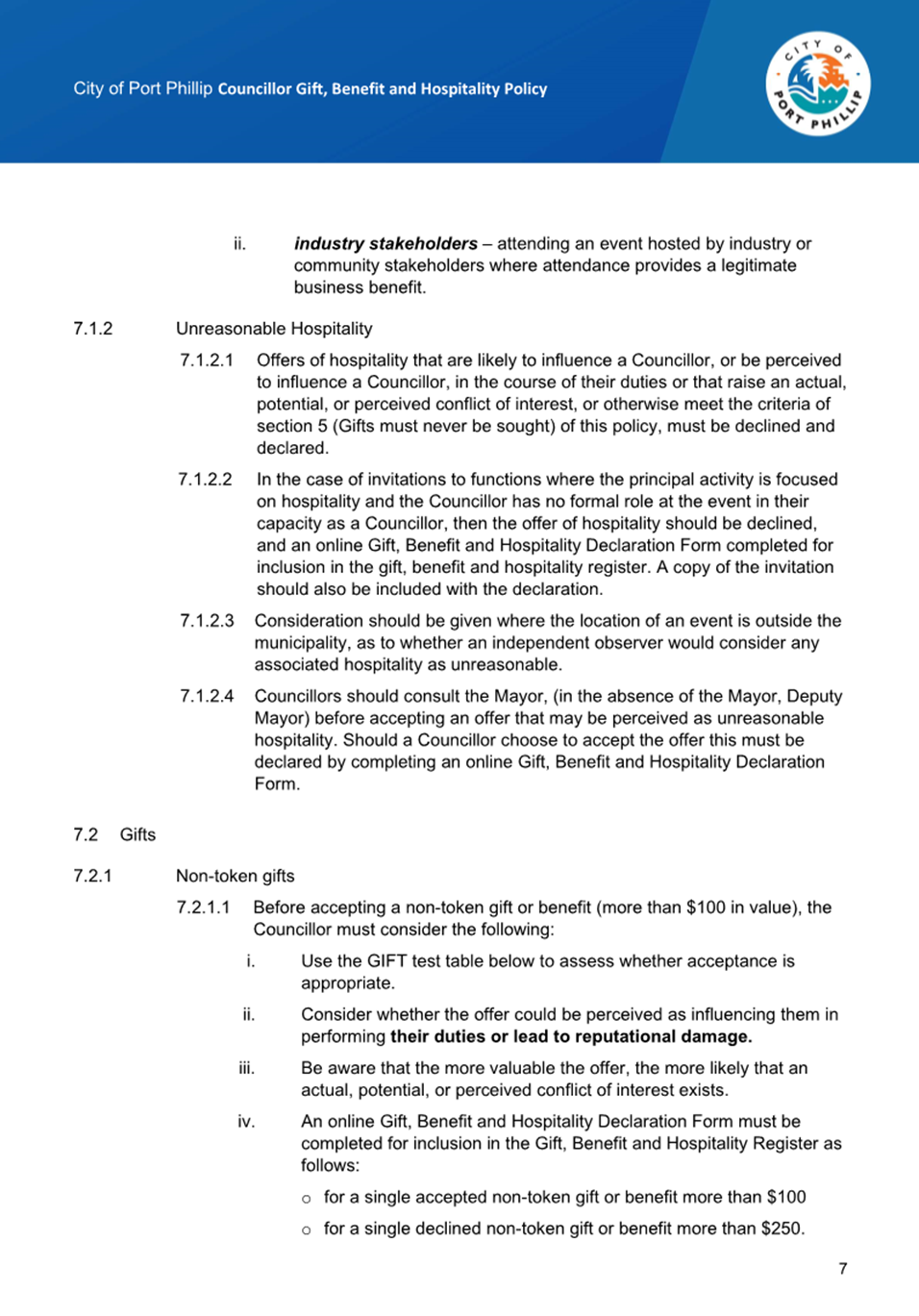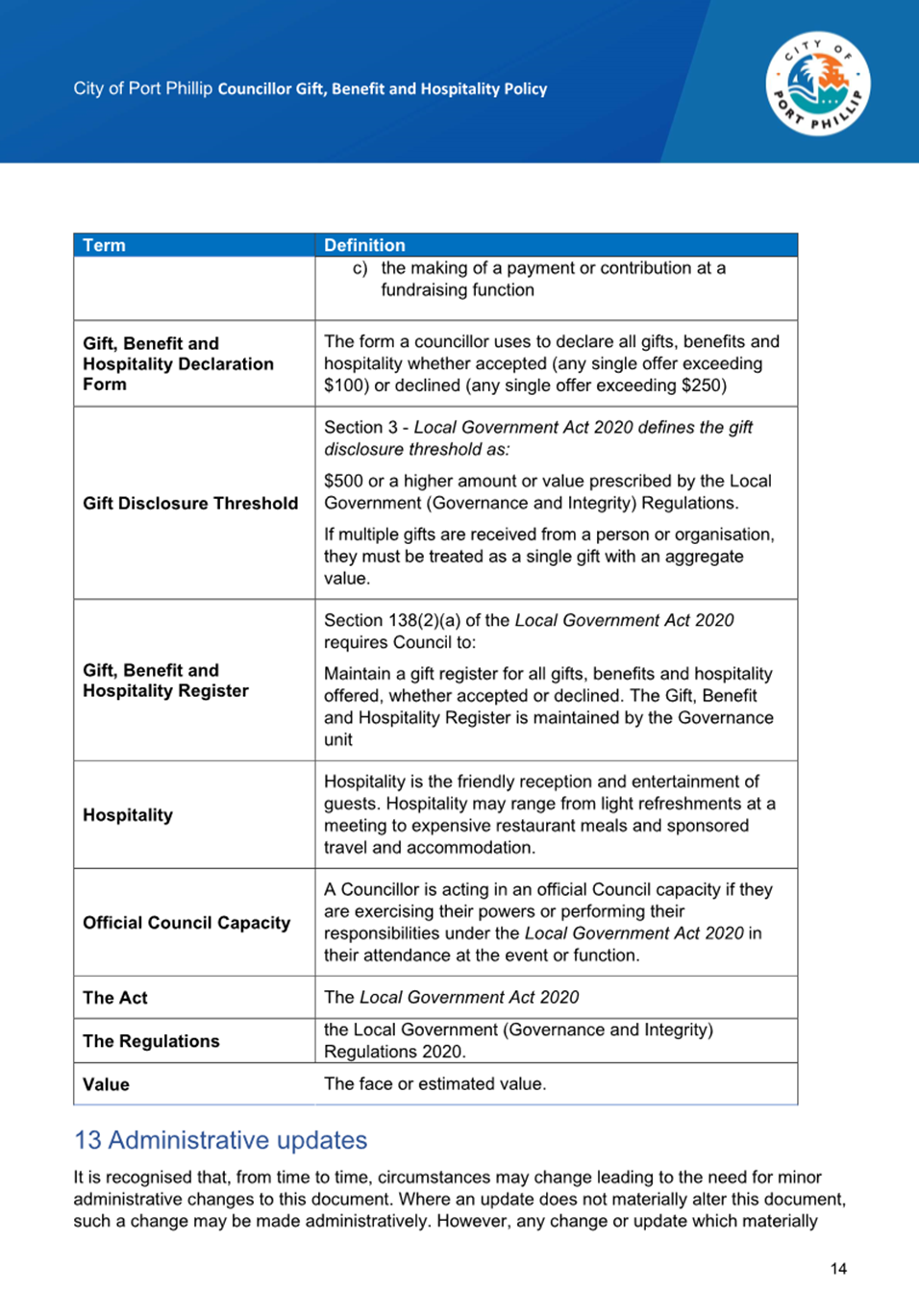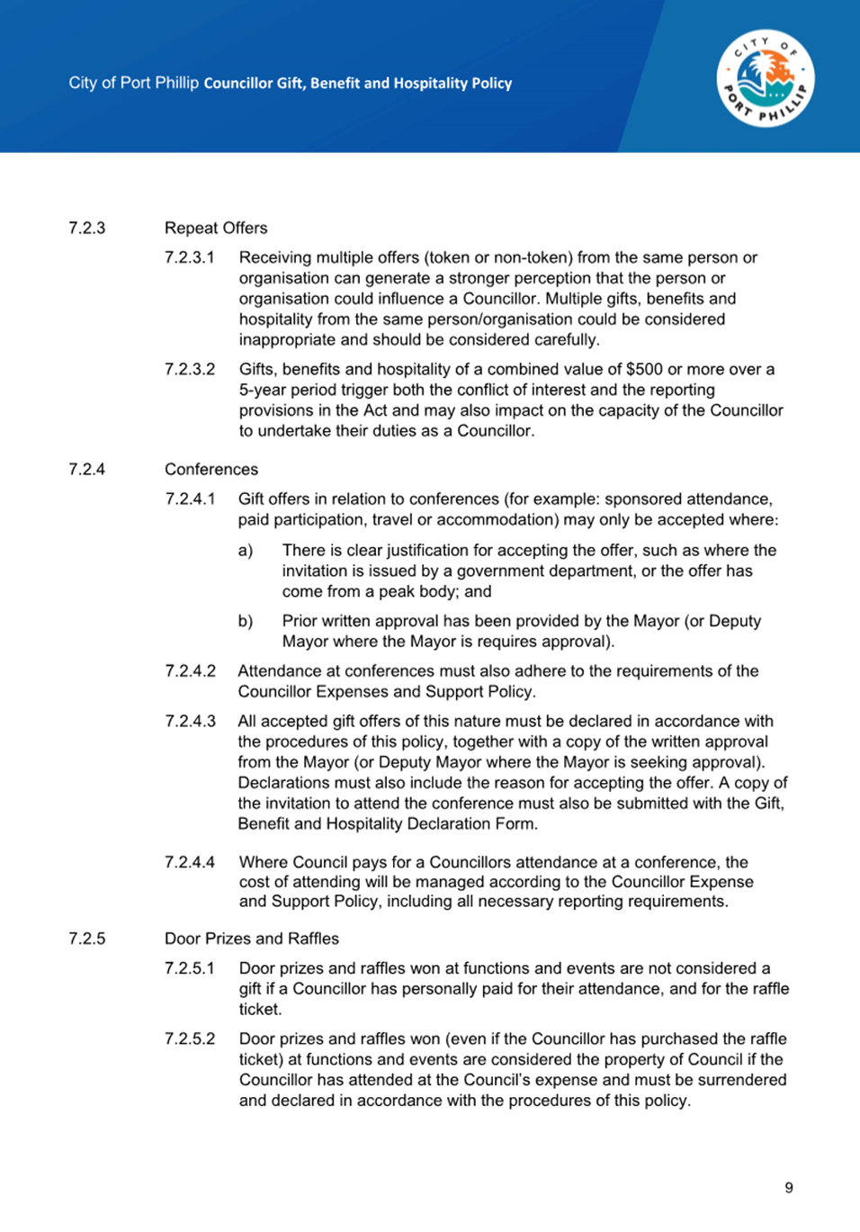 13.4 Councillor Gift, Benefit and Hospitality Policy.......... 270