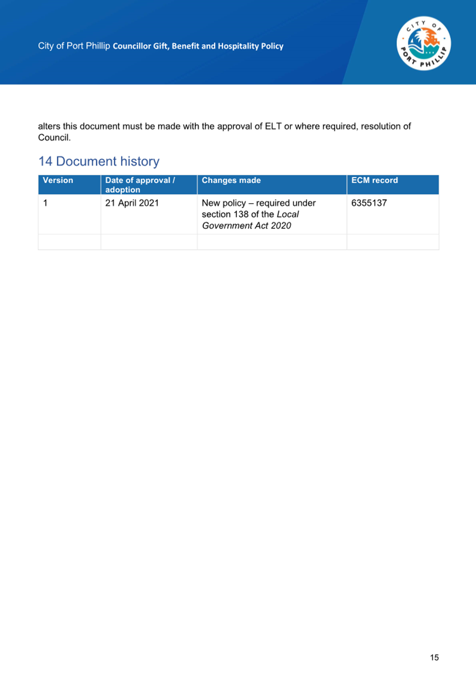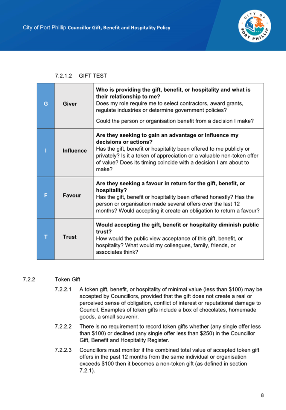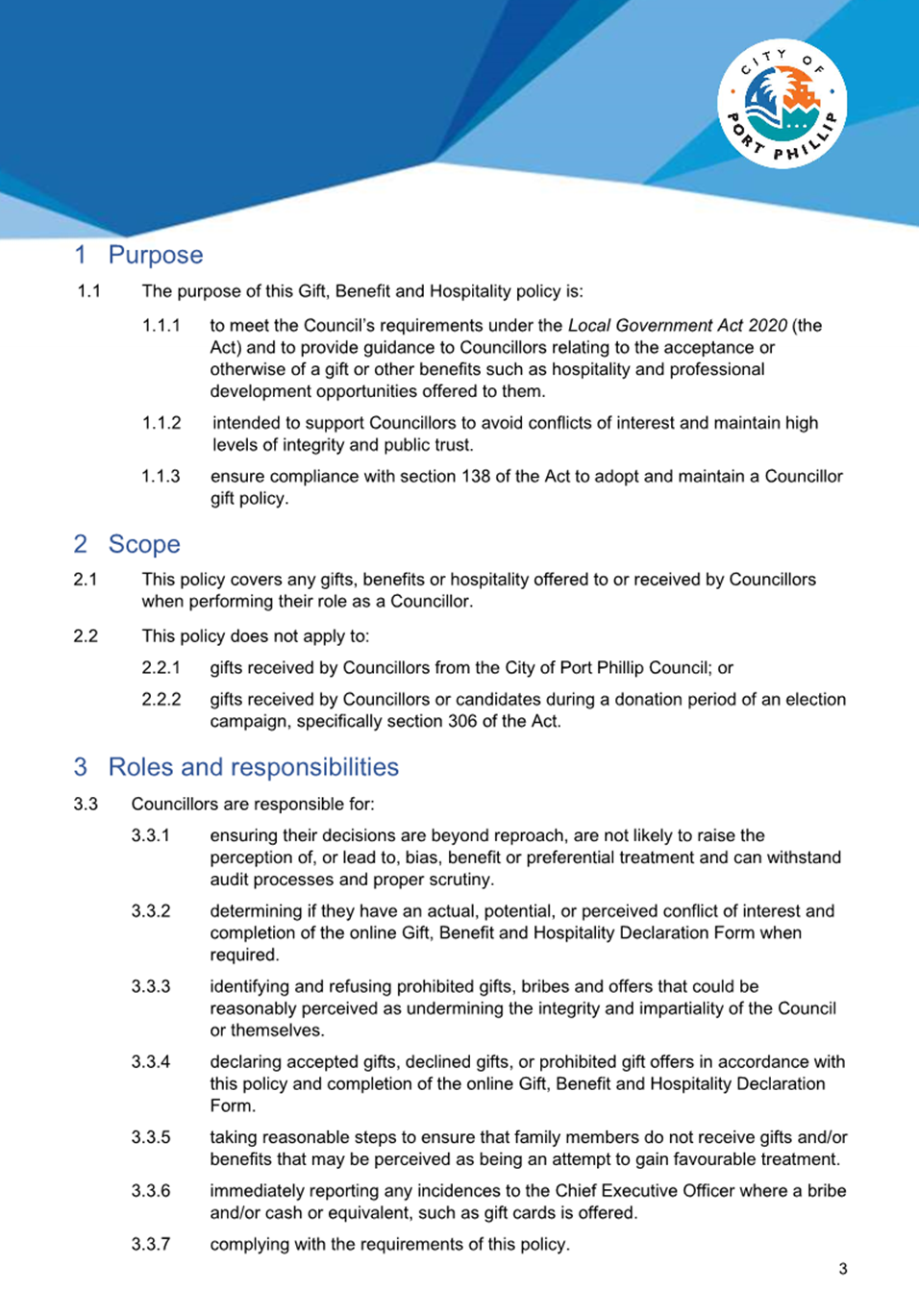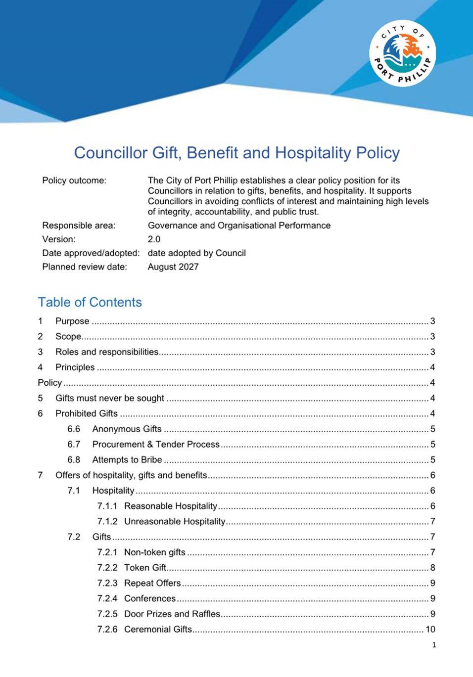 13.4 Councillor Gift, Benefit and Hospitality Policy.......... 270